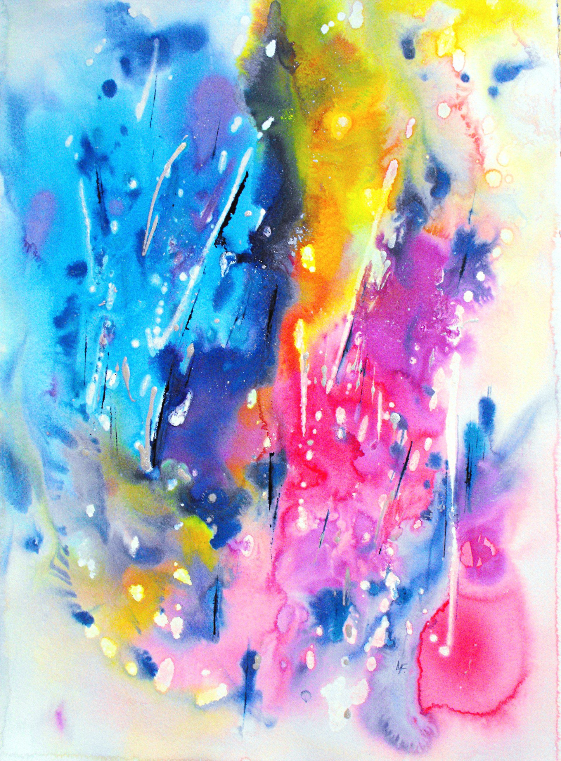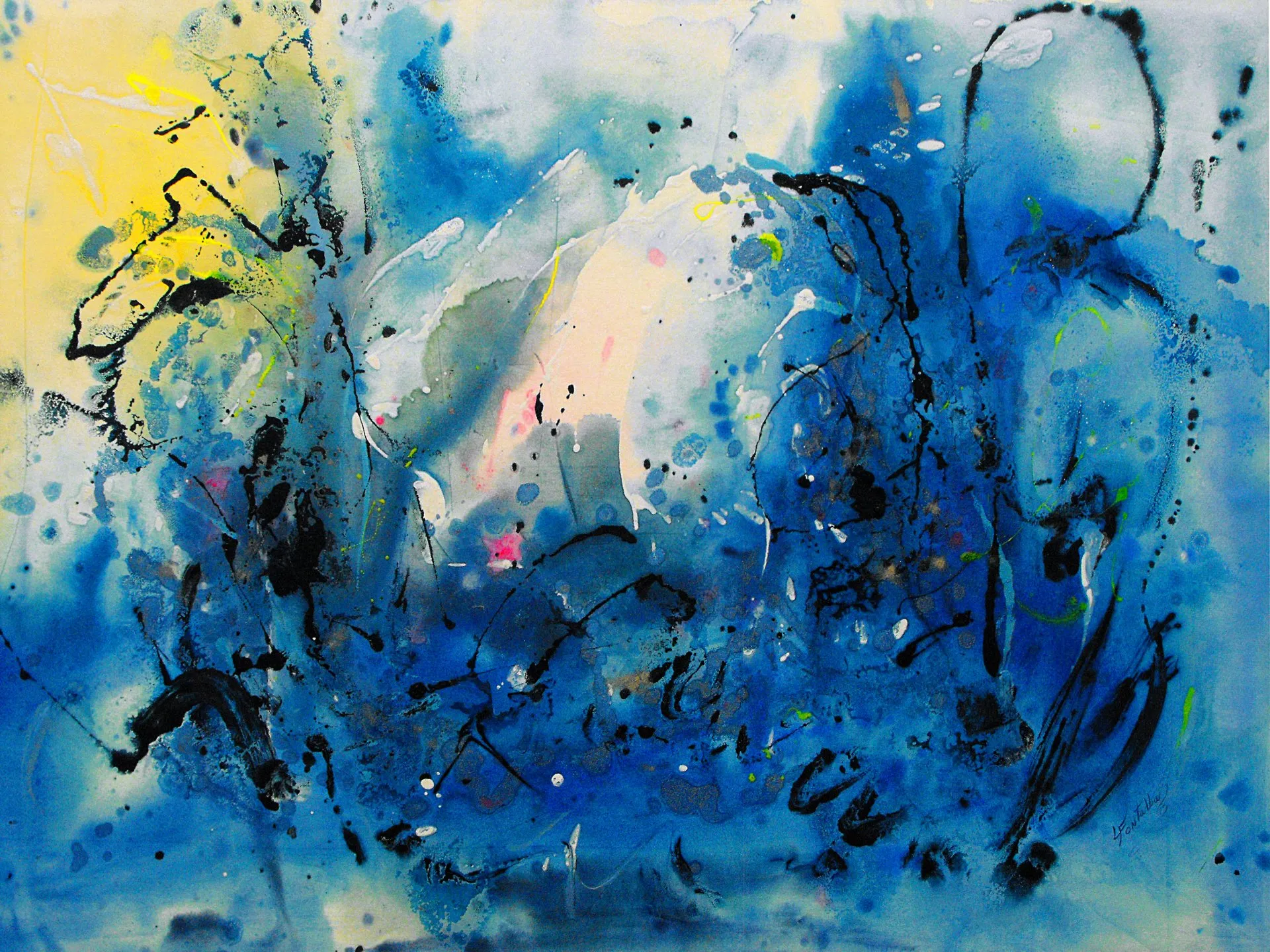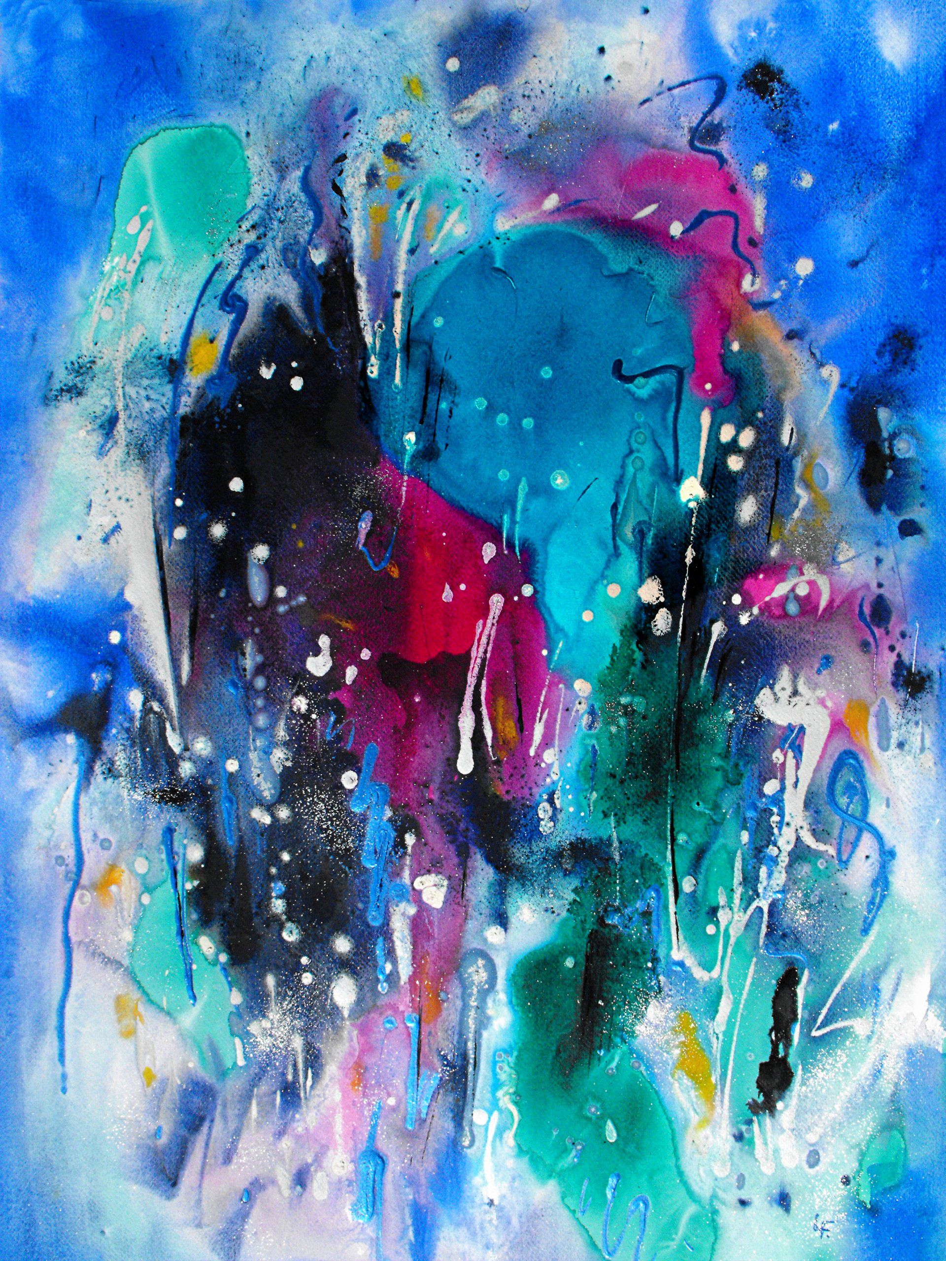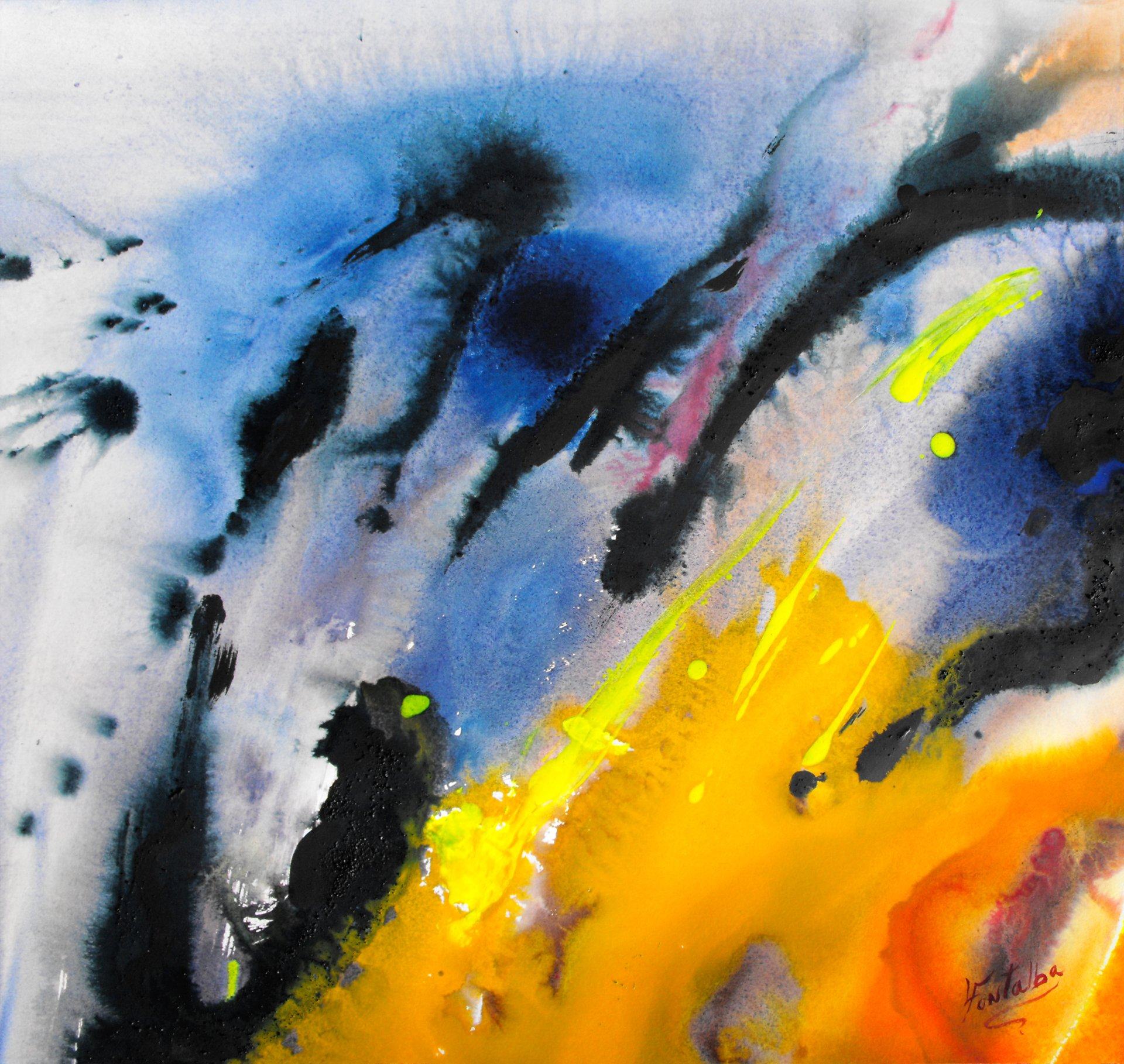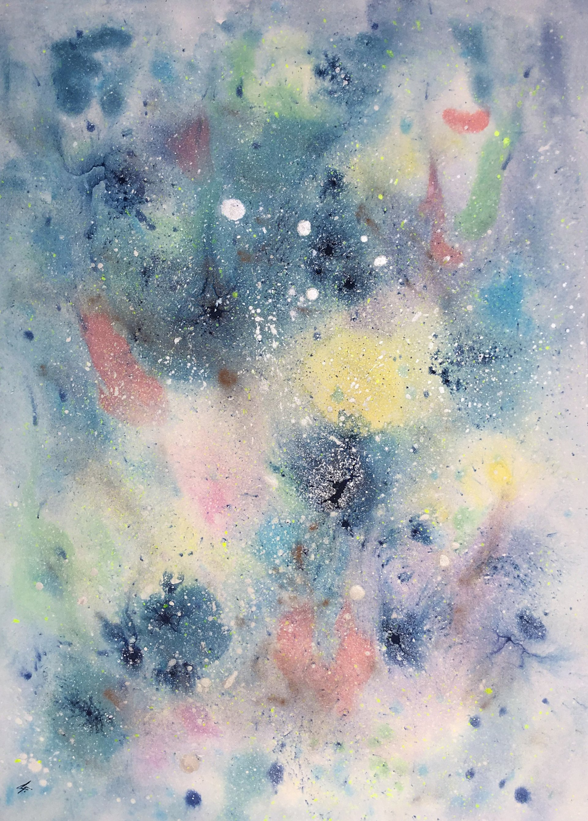 “Colore dell’ Anima” appare come la rappresentazione di uno spazio siderale, cosmico, in cui macchie di colore rosa si alternano a superfici bluastre puntellate di piccole circonferenze bianche, simili ai residui di galassie che fluttuano nell’universo. Il giallo è anche qui presente e crea una circonferenza simile a quella solare. Se nell’opera precedente vi è rappresentata l’anima nella sua interezza e nella sua inconsistente forma astratta, qui vi è invece una raffigurazione delle sfumature emotive e sensoriali che la contraddistinguono. Alla luce di ciò, l’arte di Luisa Fontalba può essere considerata un’ indagine spettroscopica del proprio mondo interiore, arricchita da un linguaggio fortemente espressivo, volto alla stimolazione estetica e sensoriale.