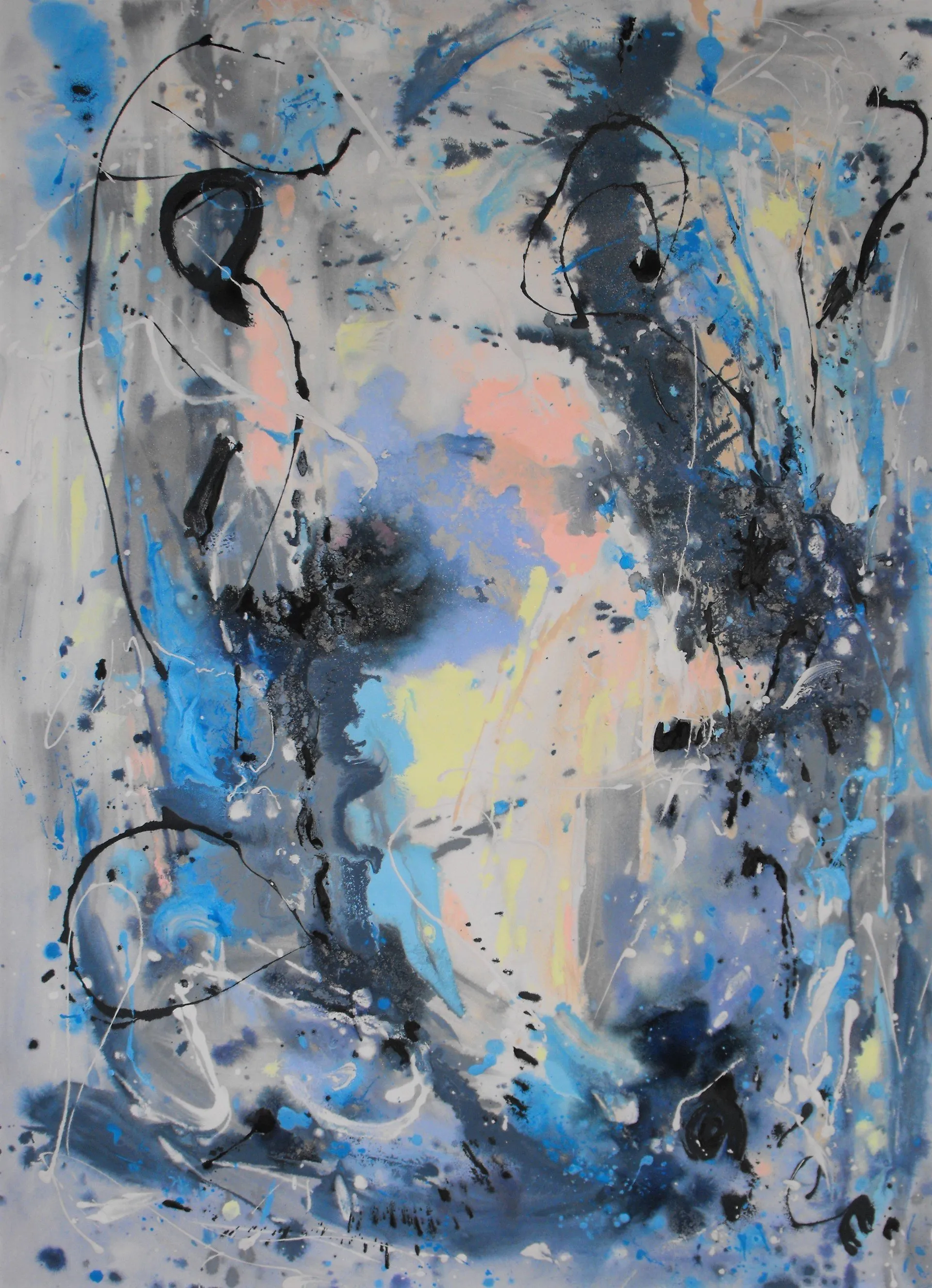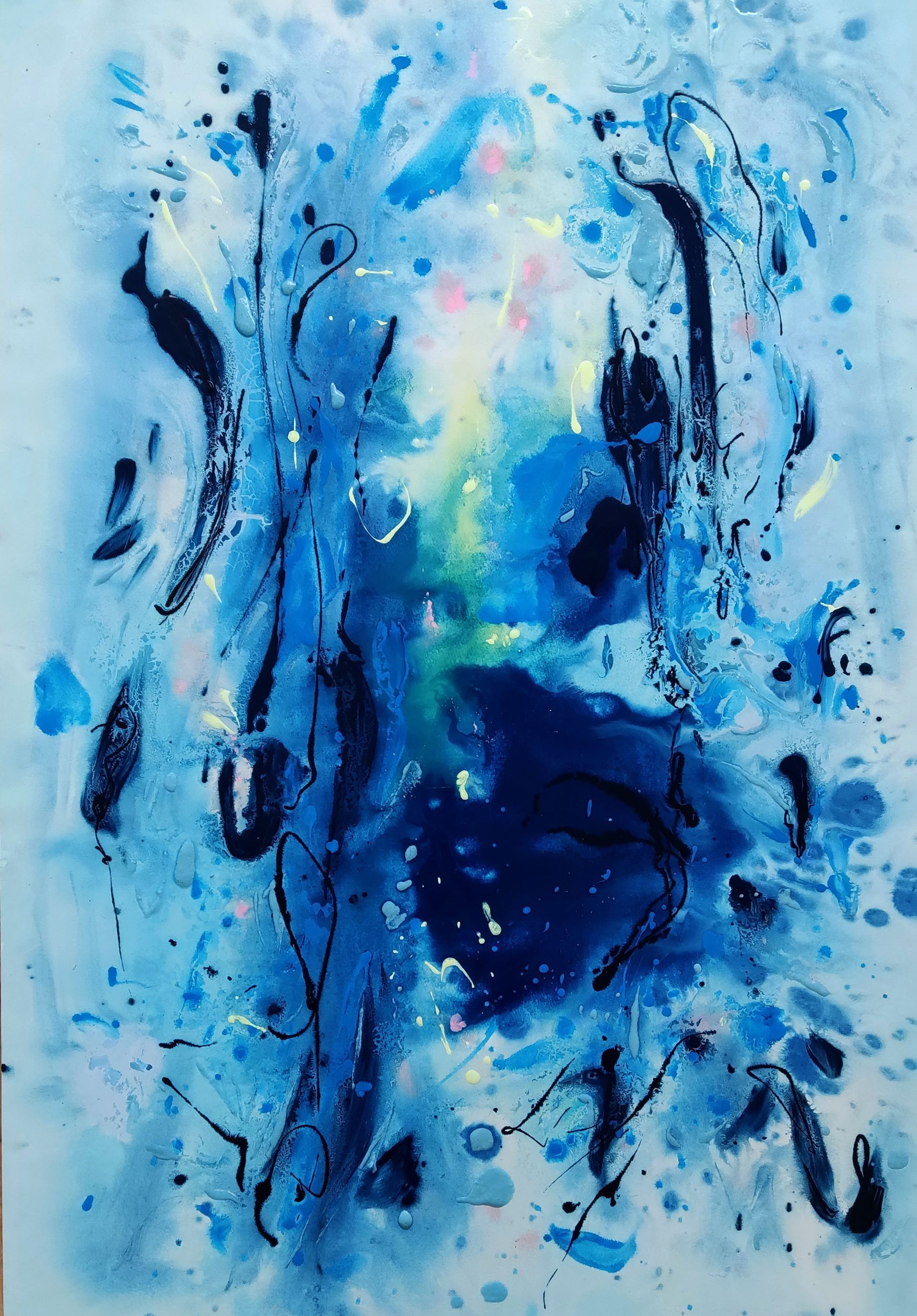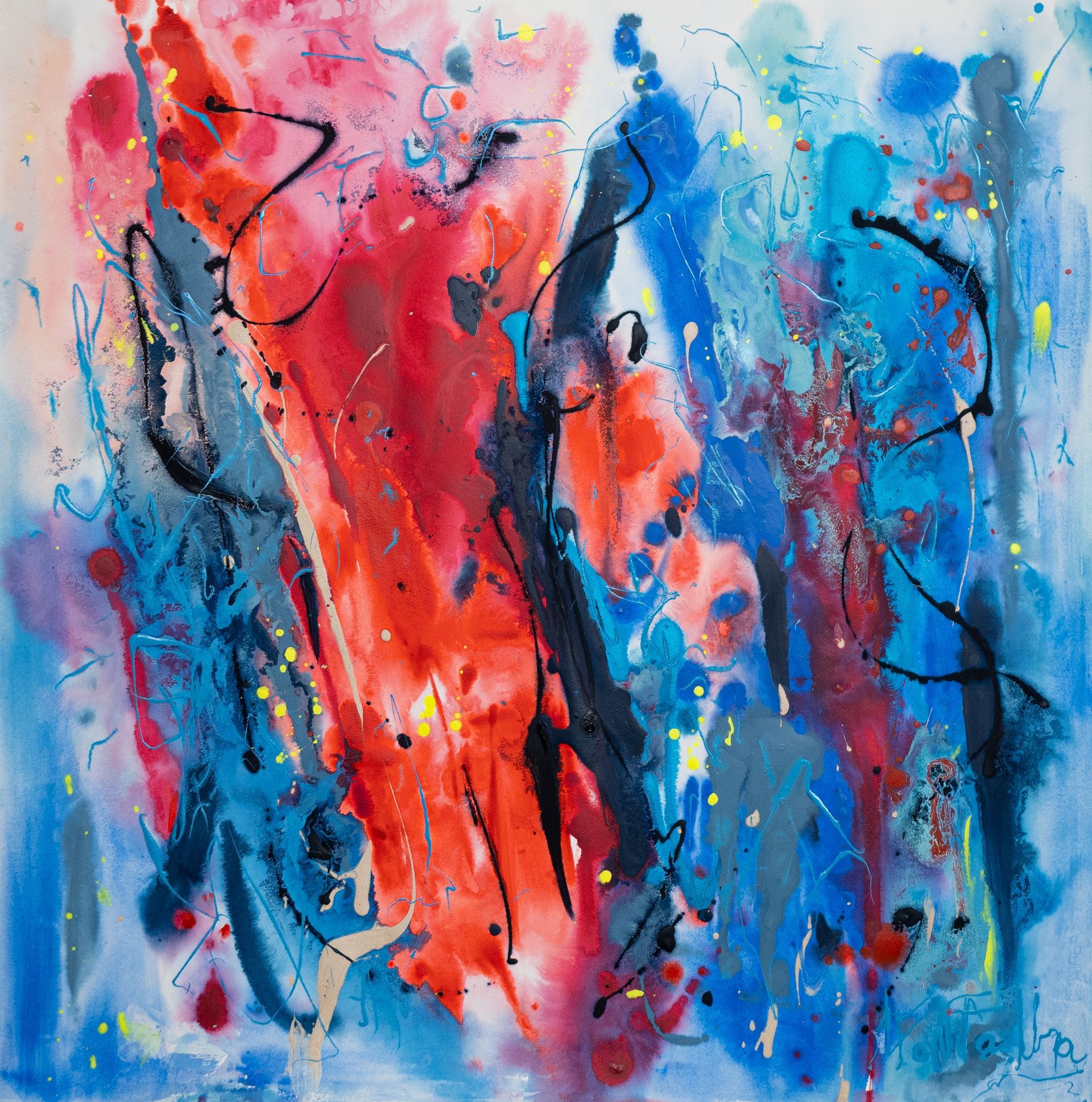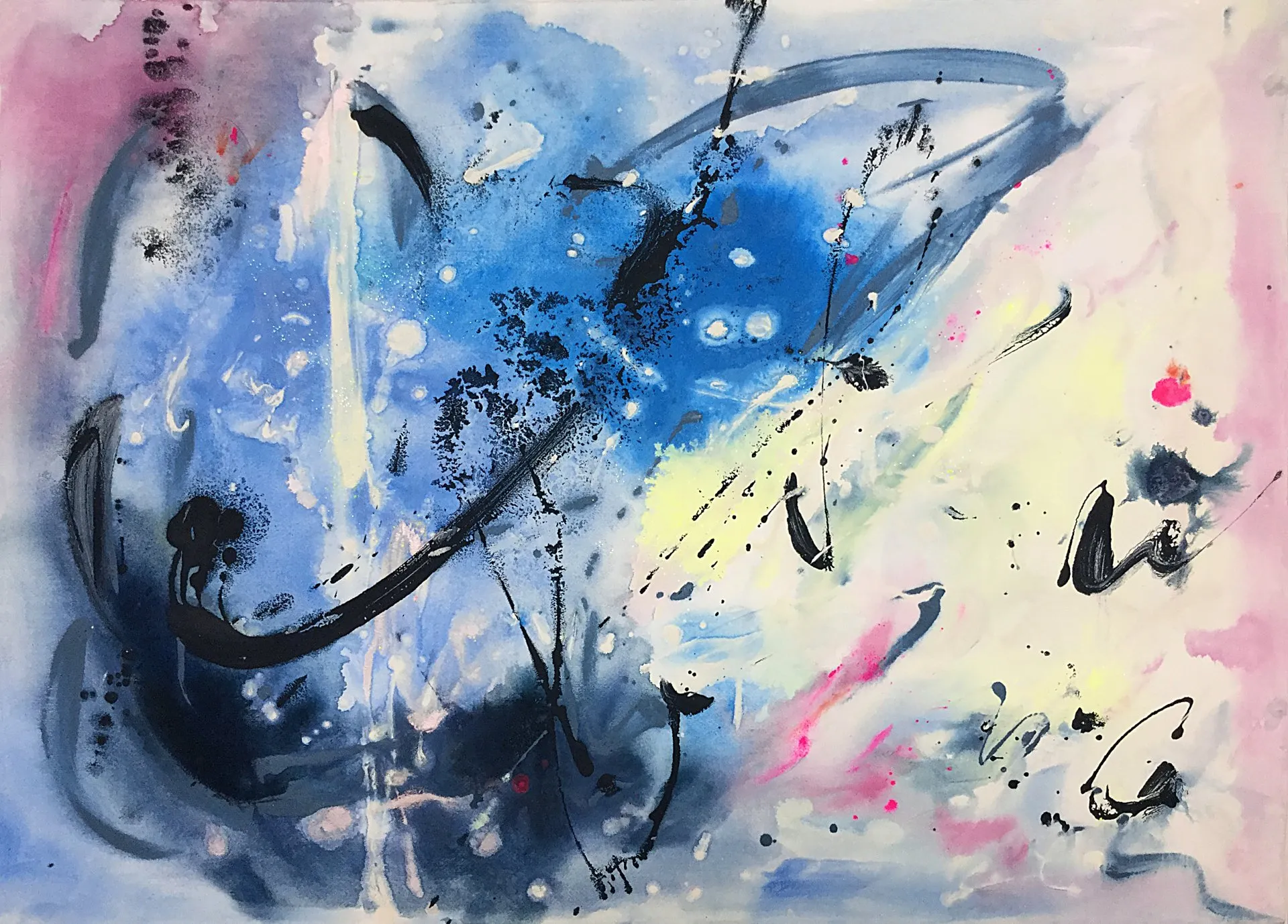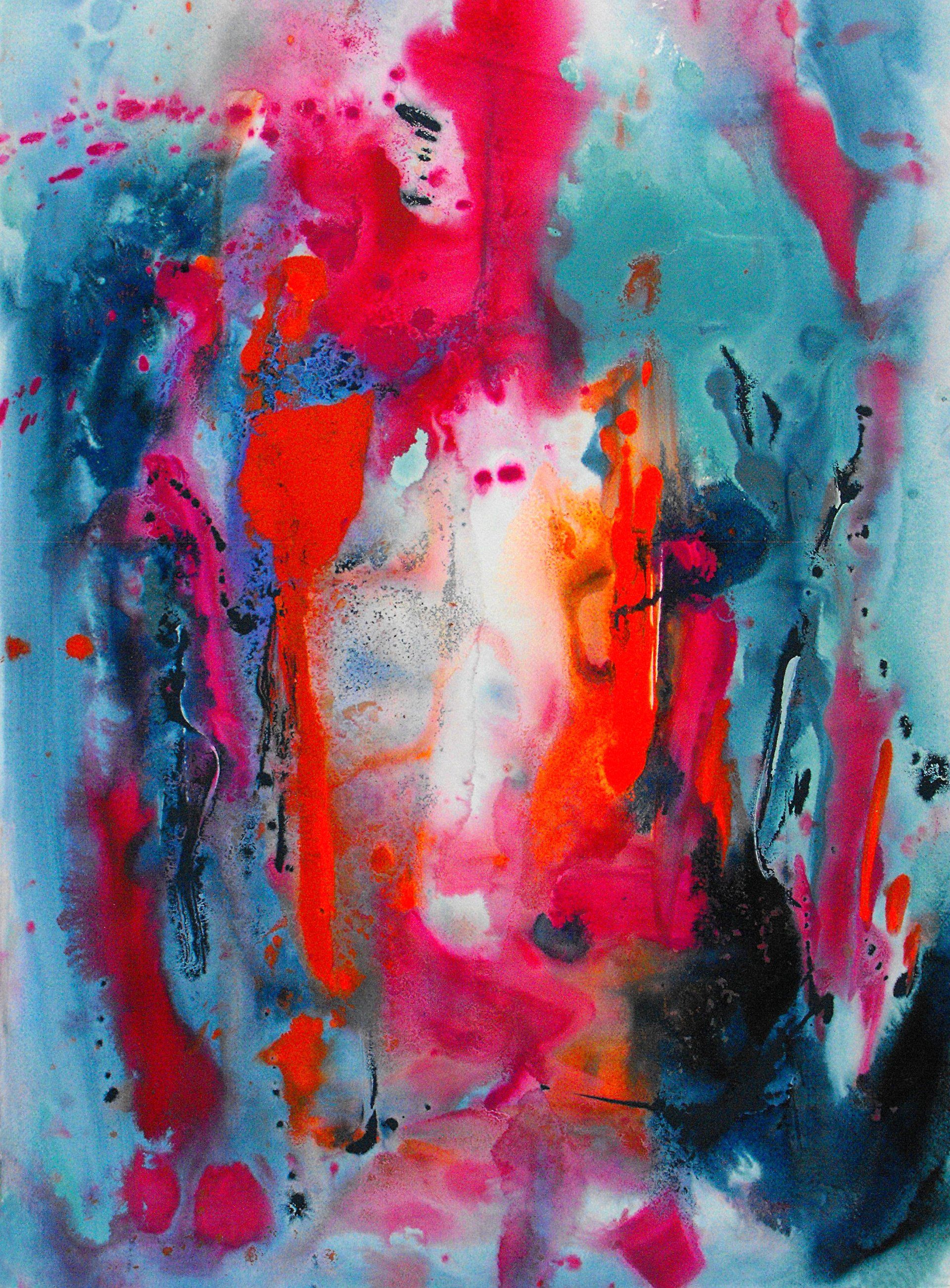 “Colore dell’ Anima” appare come la rappresentazione di uno spazio siderale, cosmico, in cui macchie di colore rosa si alternano a superfici bluastre puntellate di piccole circonferenze bianche, simili ai residui di galassie che fluttuano nell’universo. Il giallo è anche qui presente e crea una circonferenza simile a quella solare. Se nell’opera precedente vi è rappresentata l’anima nella sua interezza e nella sua inconsistente forma astratta, qui vi è invece una raffigurazione delle sfumature emotive e sensoriali che la contraddistinguono. Alla luce di ciò, l’arte di Luisa Fontalba può essere considerata un’ indagine spettroscopica del proprio mondo interiore, arricchita da un linguaggio fortemente espressivo, volto alla stimolazione estetica e sensoriale.