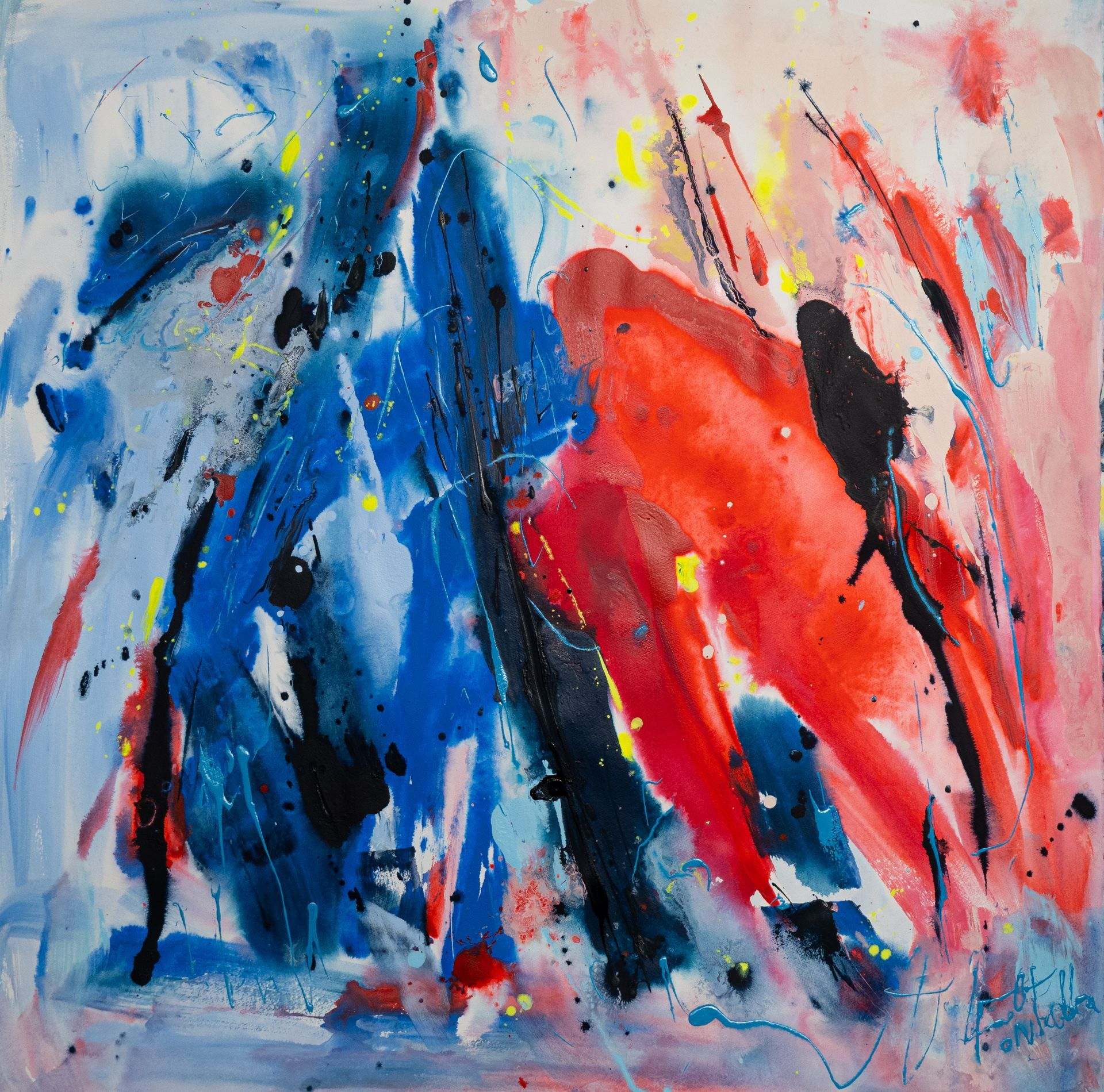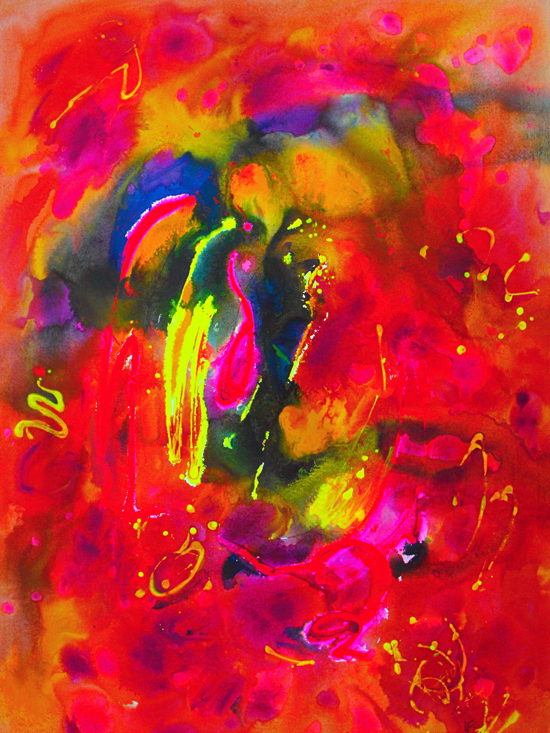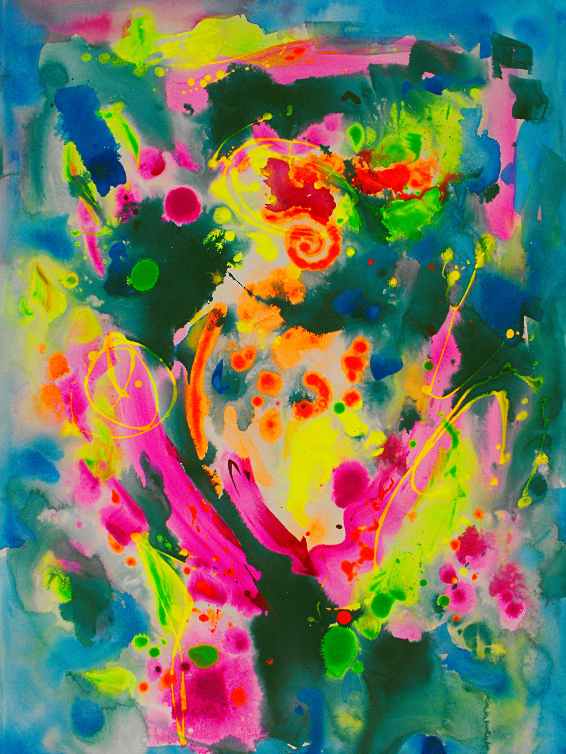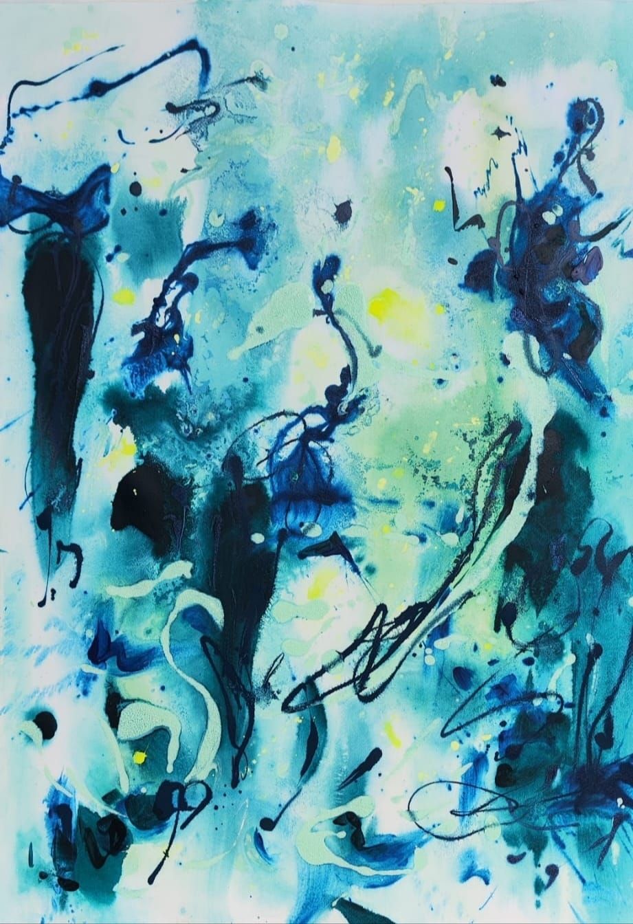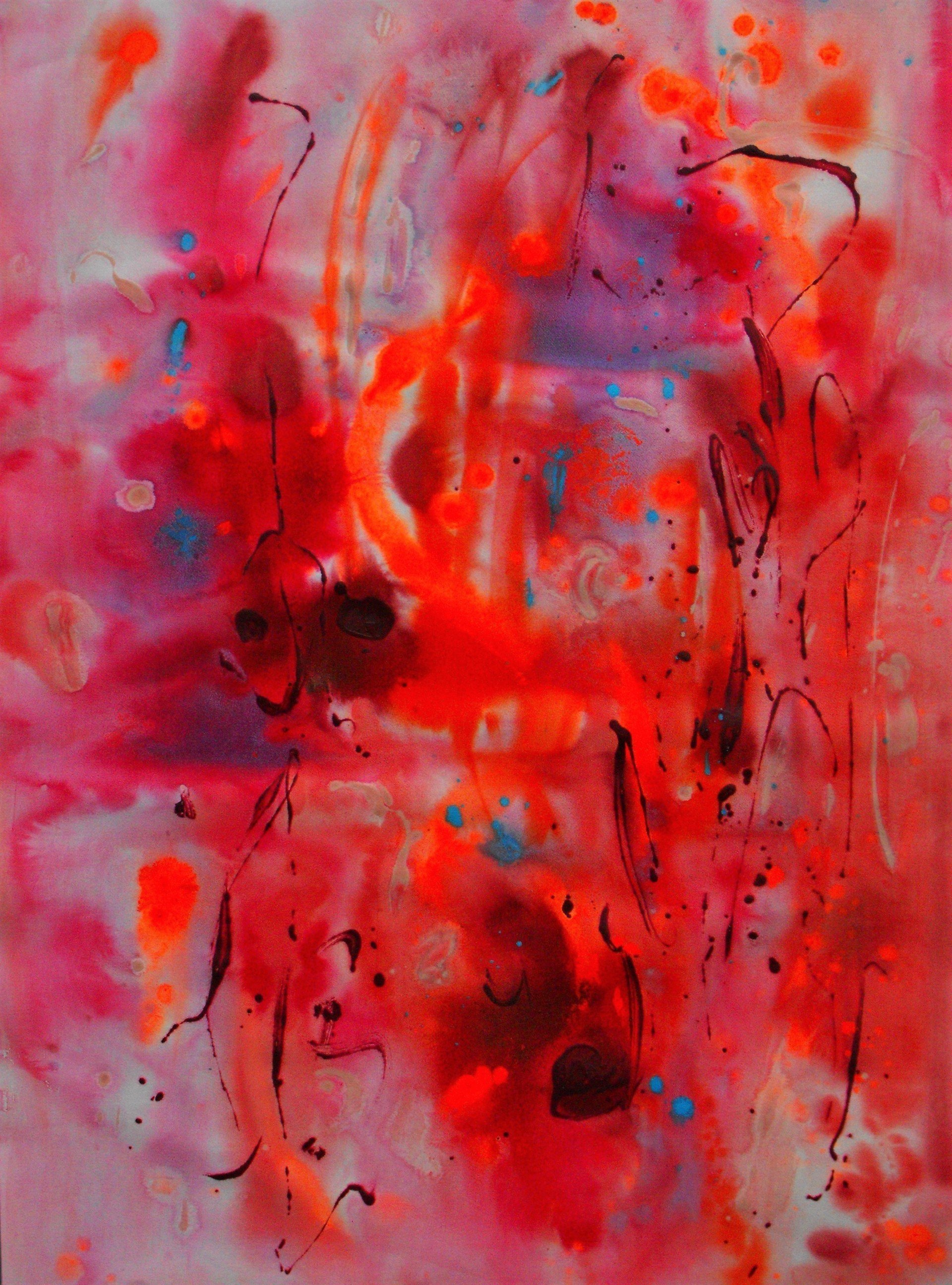 “Colore dell’ Anima” appare come la rappresentazione di uno spazio siderale, cosmico, in cui macchie di colore rosa si alternano a superfici bluastre puntellate di piccole circonferenze bianche, simili ai residui di galassie che fluttuano nell’universo. Il giallo è anche qui presente e crea una circonferenza simile a quella solare. Se nell’opera precedente vi è rappresentata l’anima nella sua interezza e nella sua inconsistente forma astratta, qui vi è invece una raffigurazione delle sfumature emotive e sensoriali che la contraddistinguono. Alla luce di ciò, l’arte di Luisa Fontalba può essere considerata un’ indagine spettroscopica del proprio mondo interiore, arricchita da un linguaggio fortemente espressivo, volto alla stimolazione estetica e sensoriale.