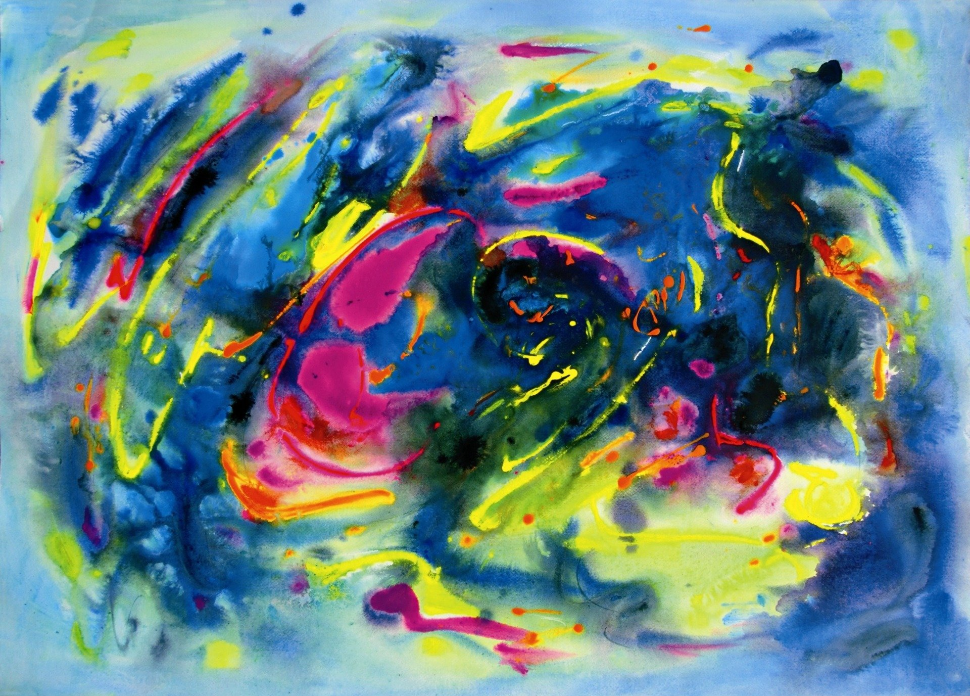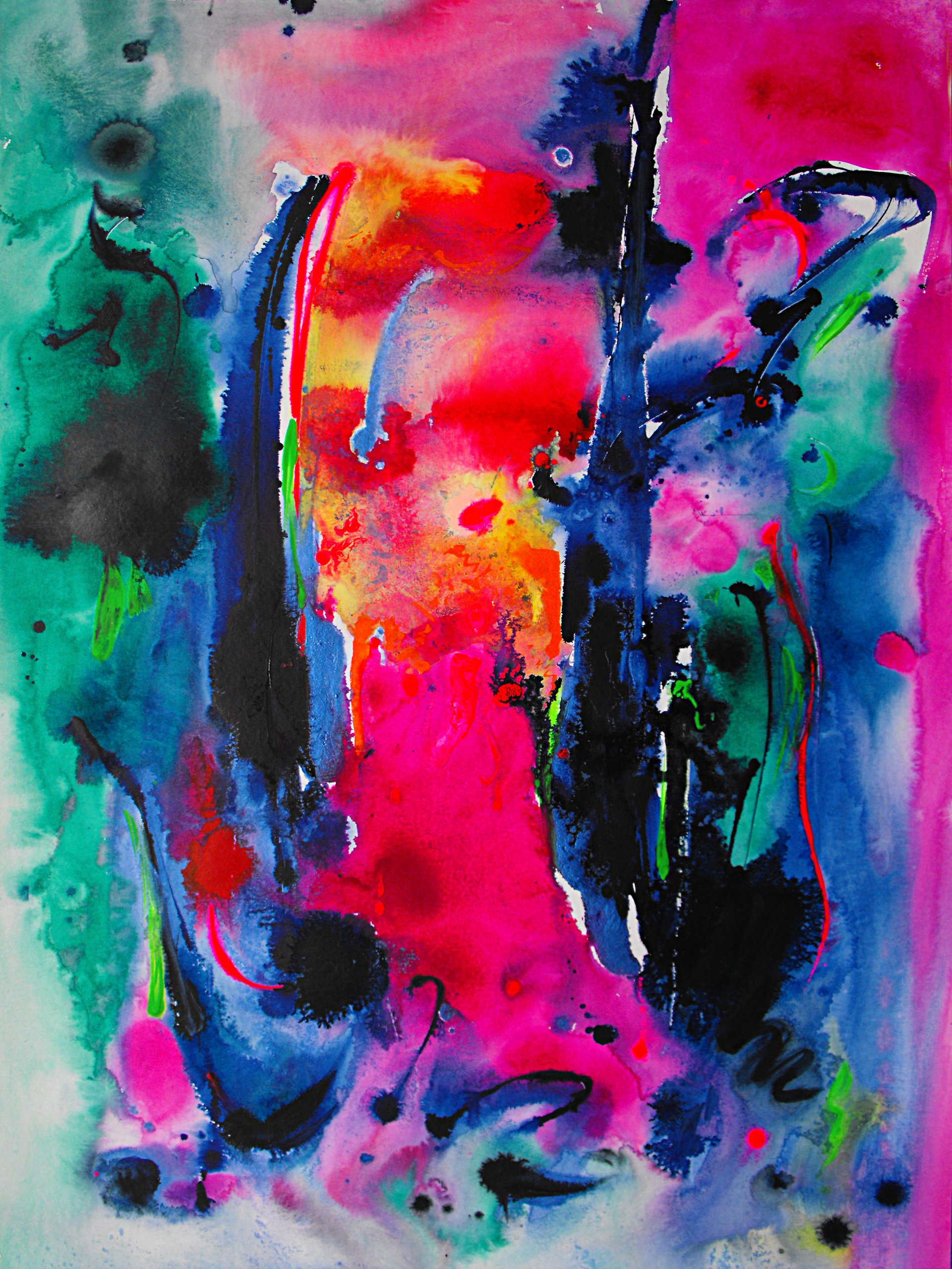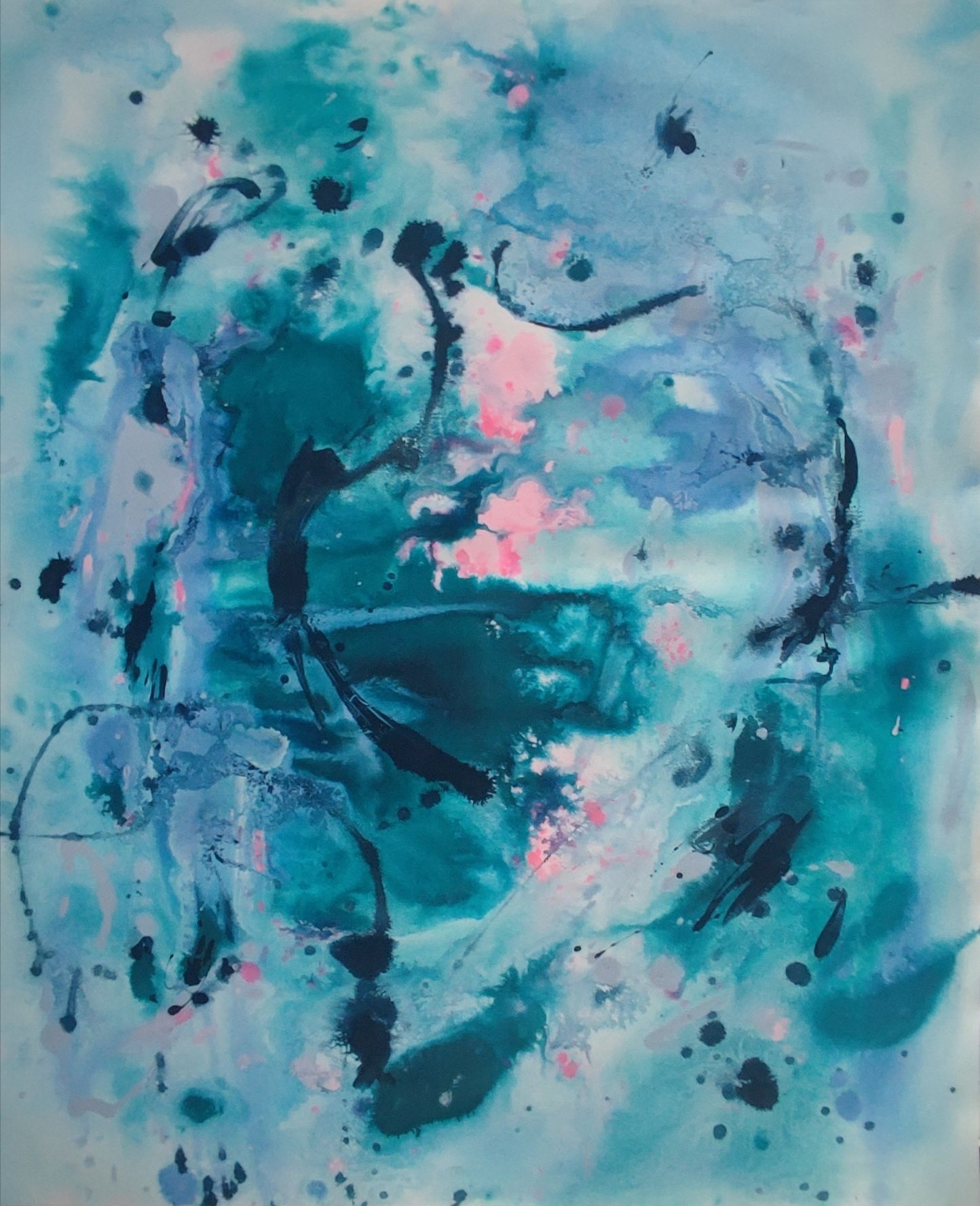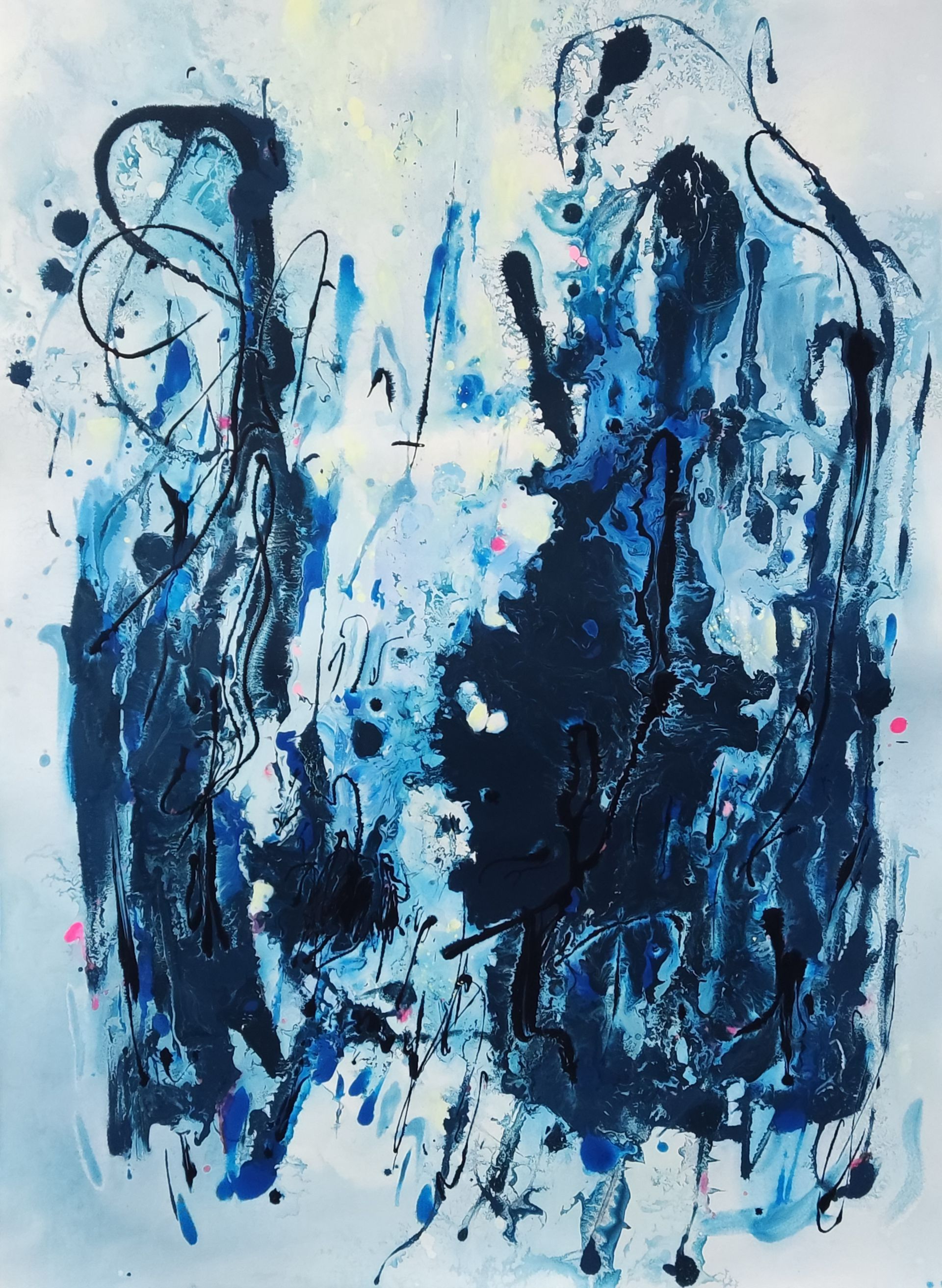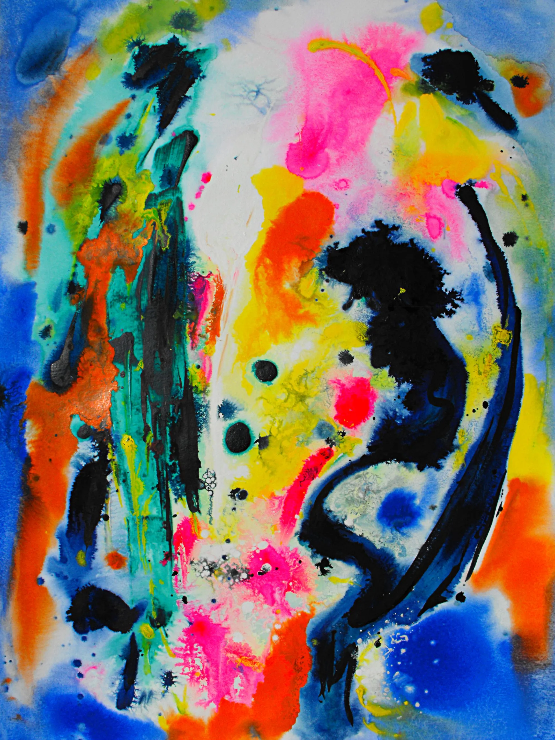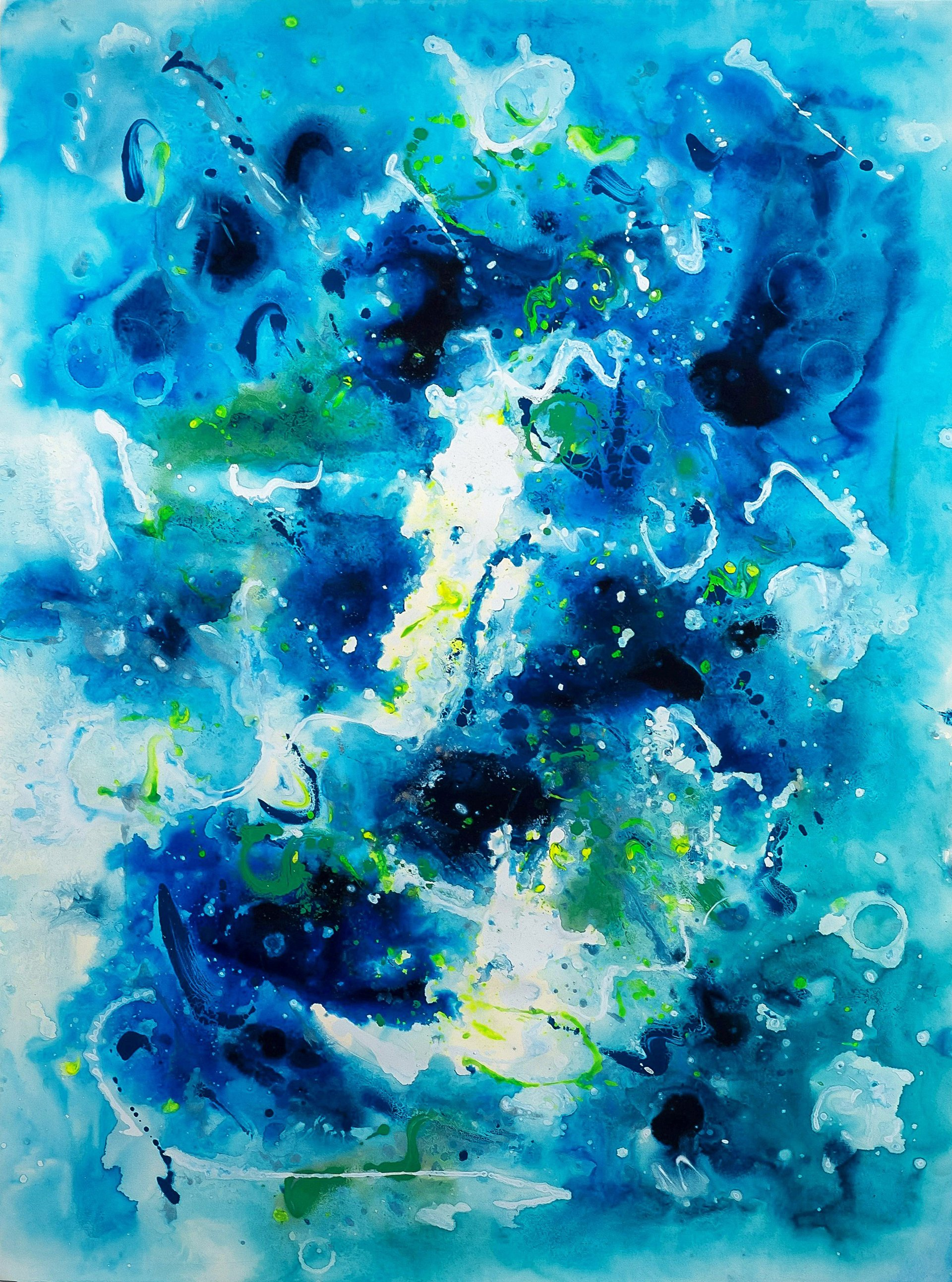 “Colore dell’ Anima” appare come la rappresentazione di uno spazio siderale, cosmico, in cui macchie di colore rosa si alternano a superfici bluastre puntellate di piccole circonferenze bianche, simili ai residui di galassie che fluttuano nell’universo. Il giallo è anche qui presente e crea una circonferenza simile a quella solare. Se nell’opera precedente vi è rappresentata l’anima nella sua interezza e nella sua inconsistente forma astratta, qui vi è invece una raffigurazione delle sfumature emotive e sensoriali che la contraddistinguono. Alla luce di ciò, l’arte di Luisa Fontalba può essere considerata un’ indagine spettroscopica del proprio mondo interiore, arricchita da un linguaggio fortemente espressivo, volto alla stimolazione estetica e sensoriale.