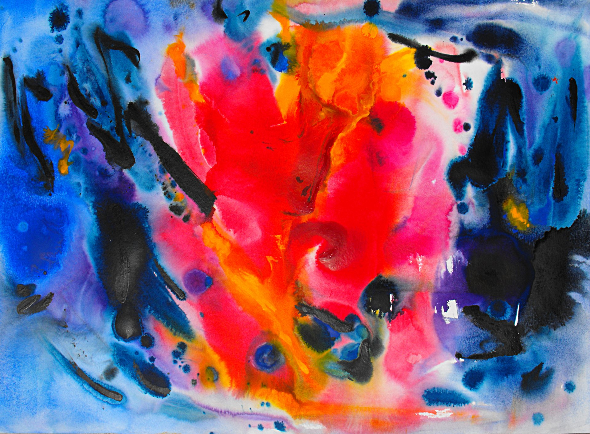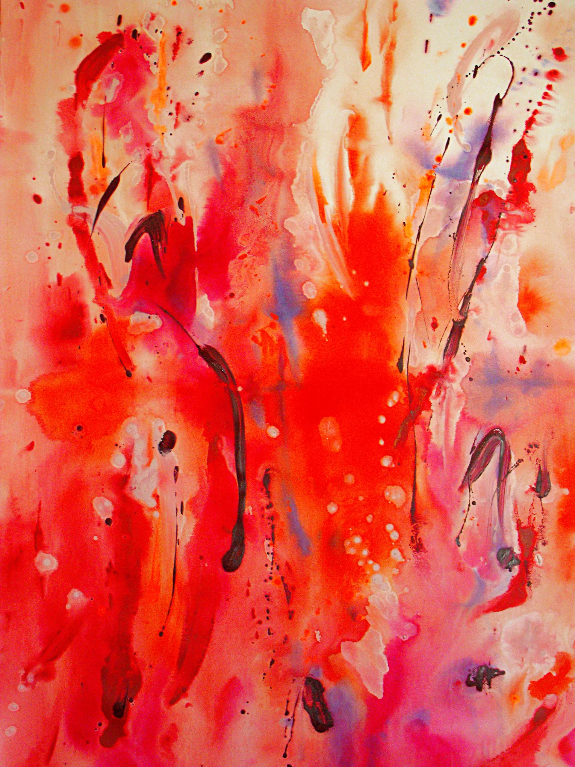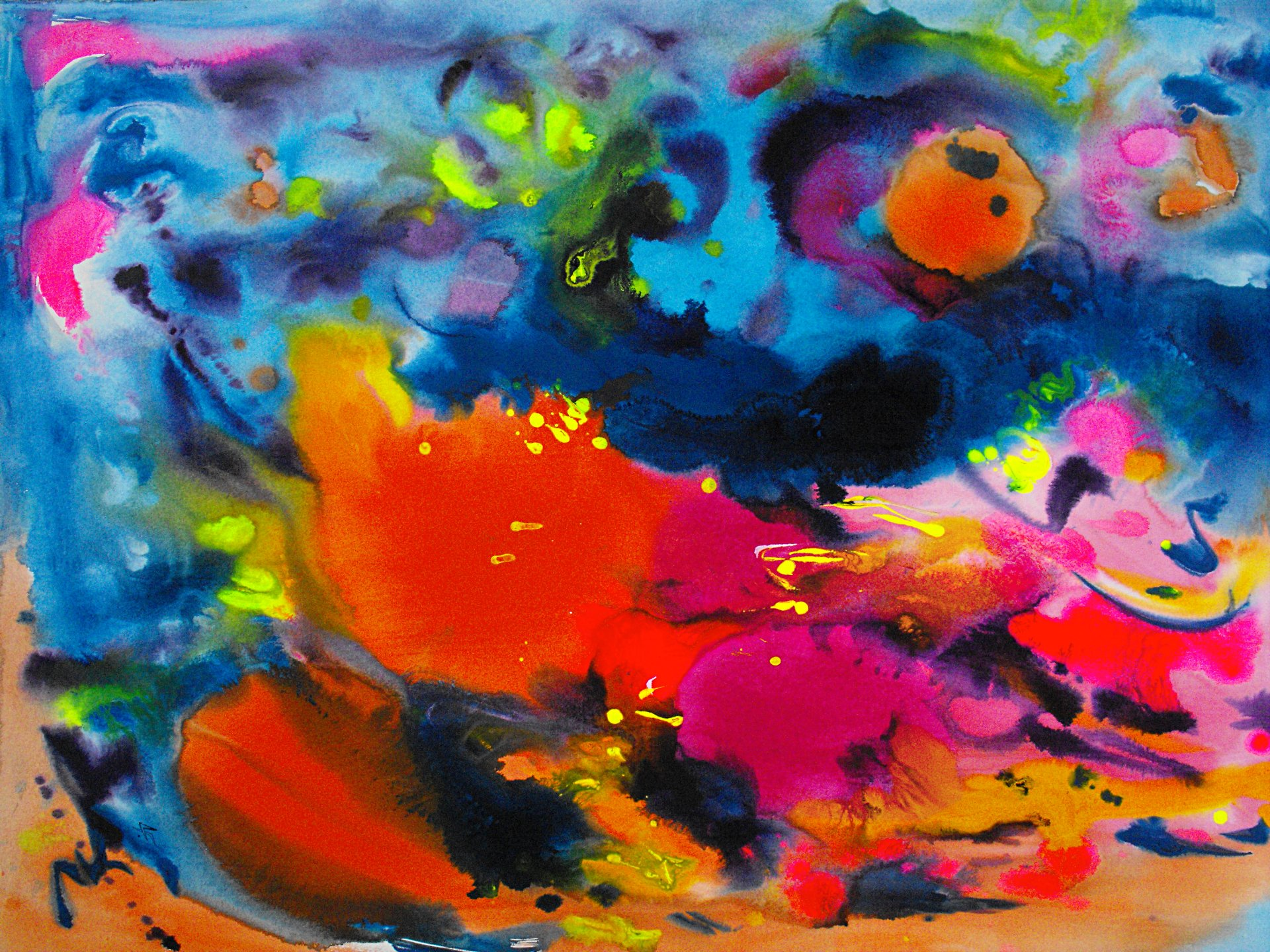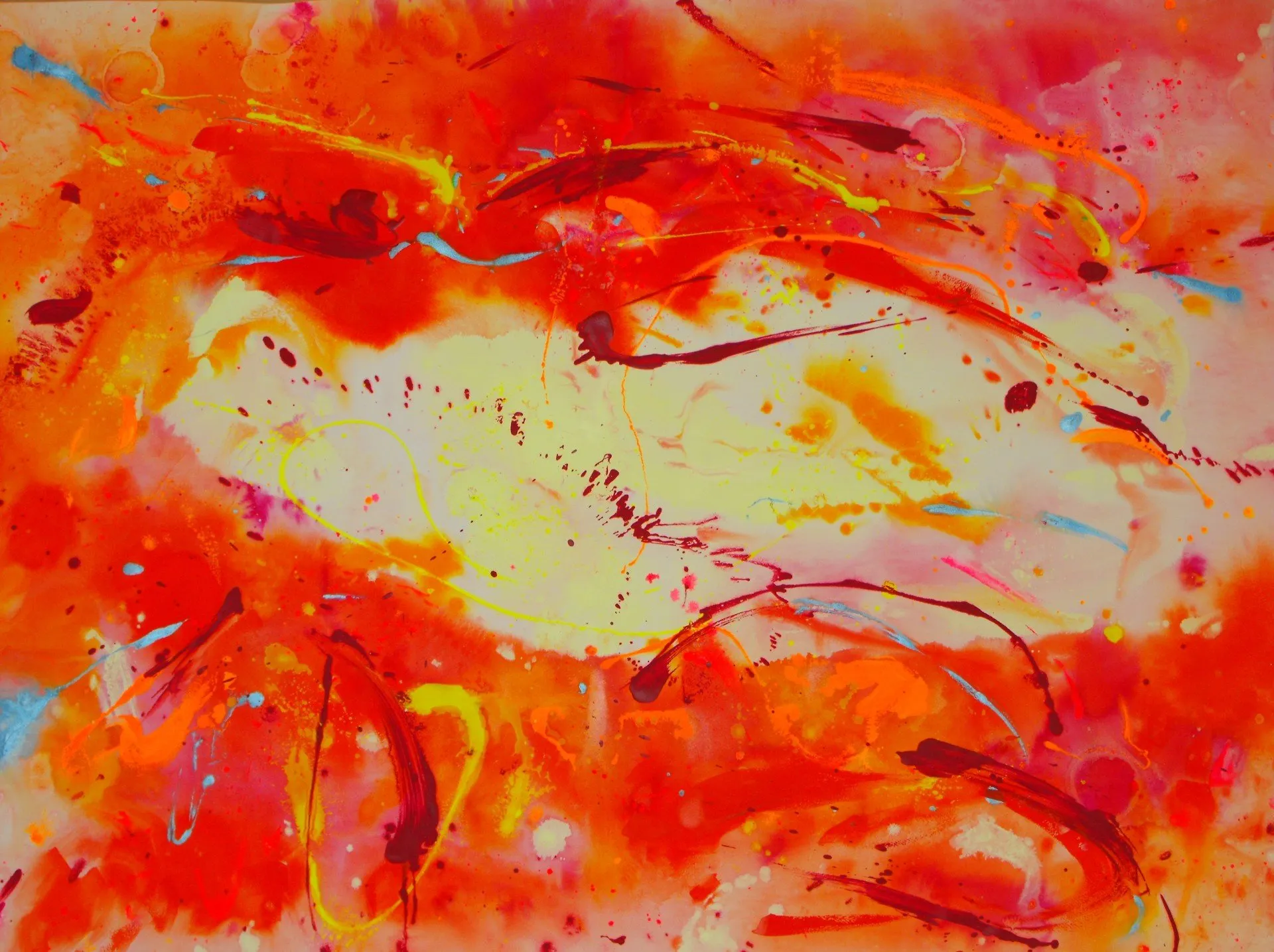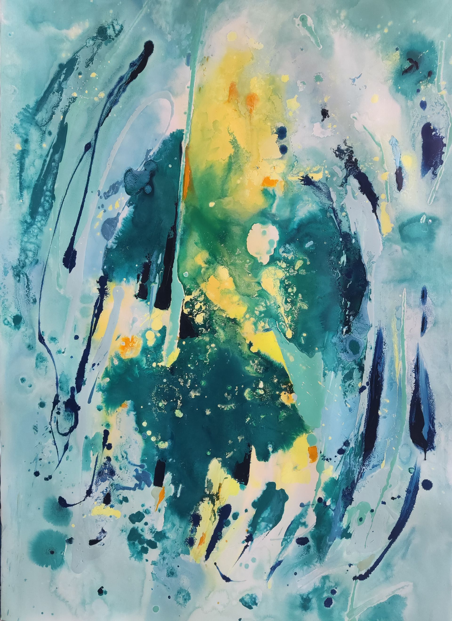 “Colore dell’ Anima” appare come la rappresentazione di uno spazio siderale, cosmico, in cui macchie di colore rosa si alternano a superfici bluastre puntellate di piccole circonferenze bianche, simili ai residui di galassie che fluttuano nell’universo. Il giallo è anche qui presente e crea una circonferenza simile a quella solare. Se nell’opera precedente vi è rappresentata l’anima nella sua interezza e nella sua inconsistente forma astratta, qui vi è invece una raffigurazione delle sfumature emotive e sensoriali che la contraddistinguono. Alla luce di ciò, l’arte di Luisa Fontalba può essere considerata un’ indagine spettroscopica del proprio mondo interiore, arricchita da un linguaggio fortemente espressivo, volto alla stimolazione estetica e sensoriale.