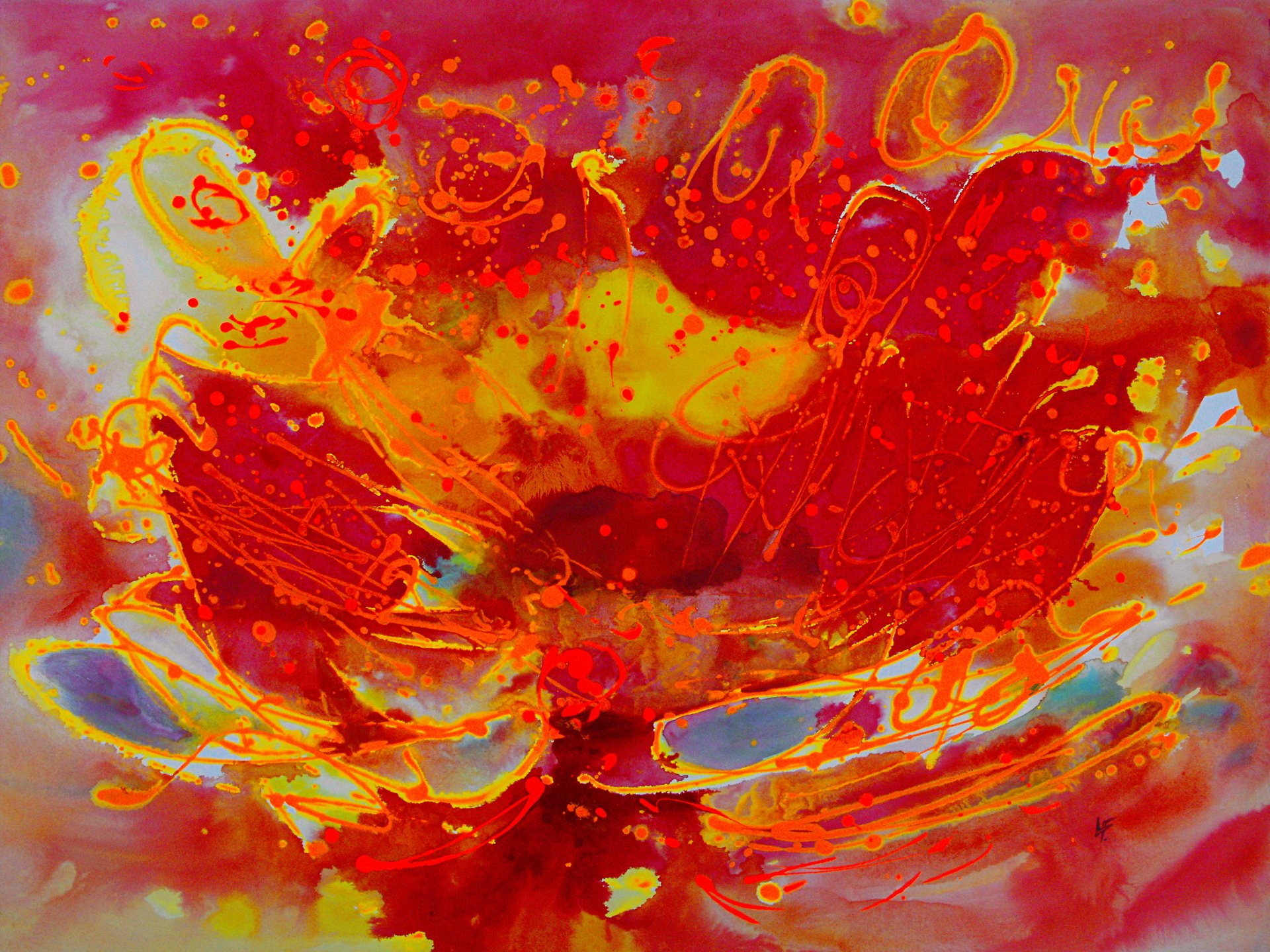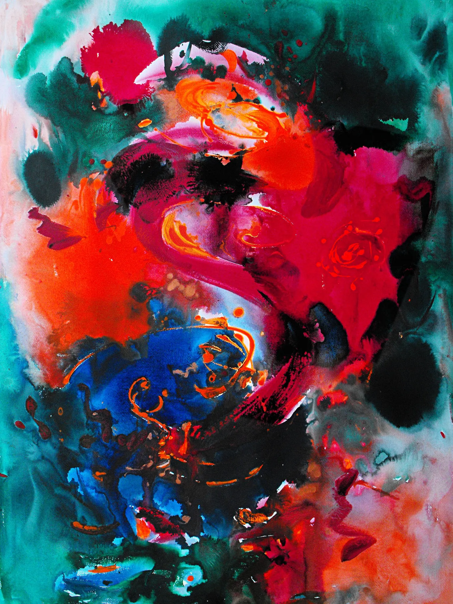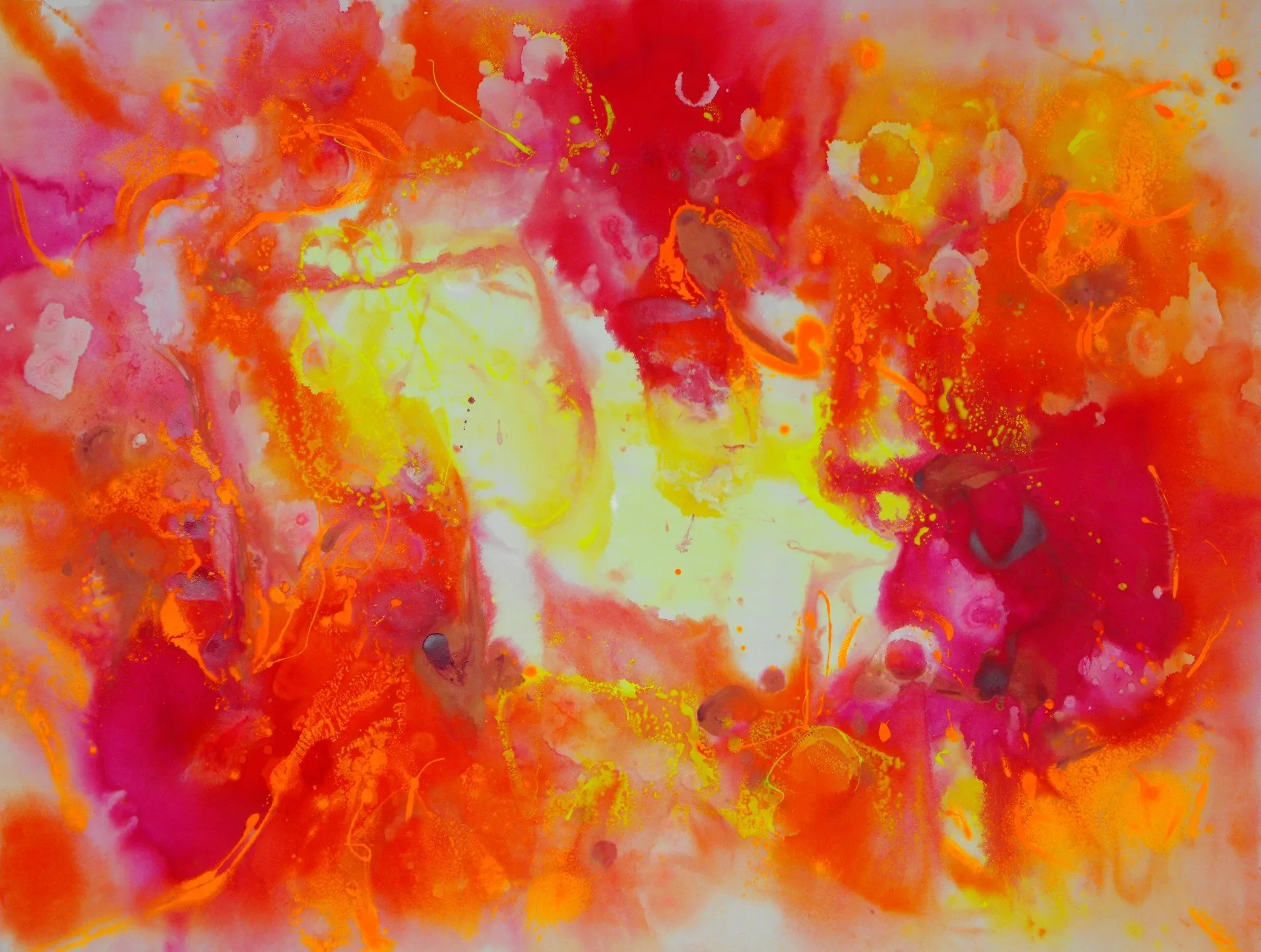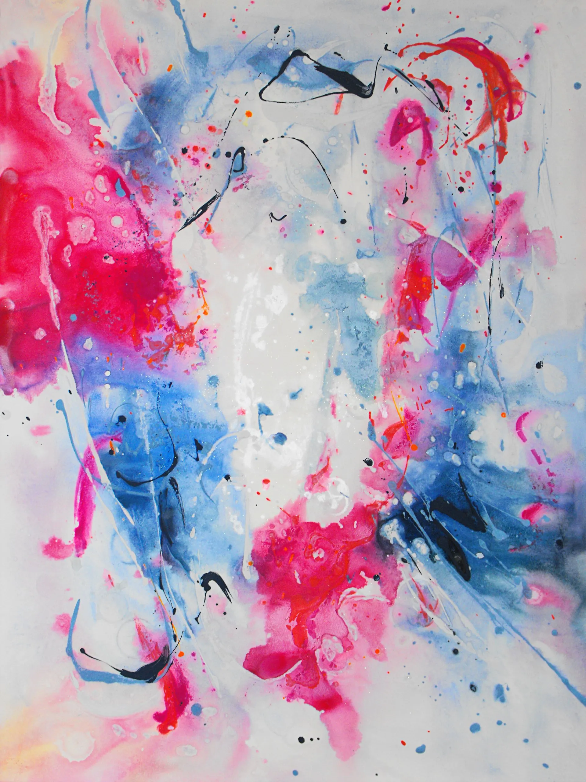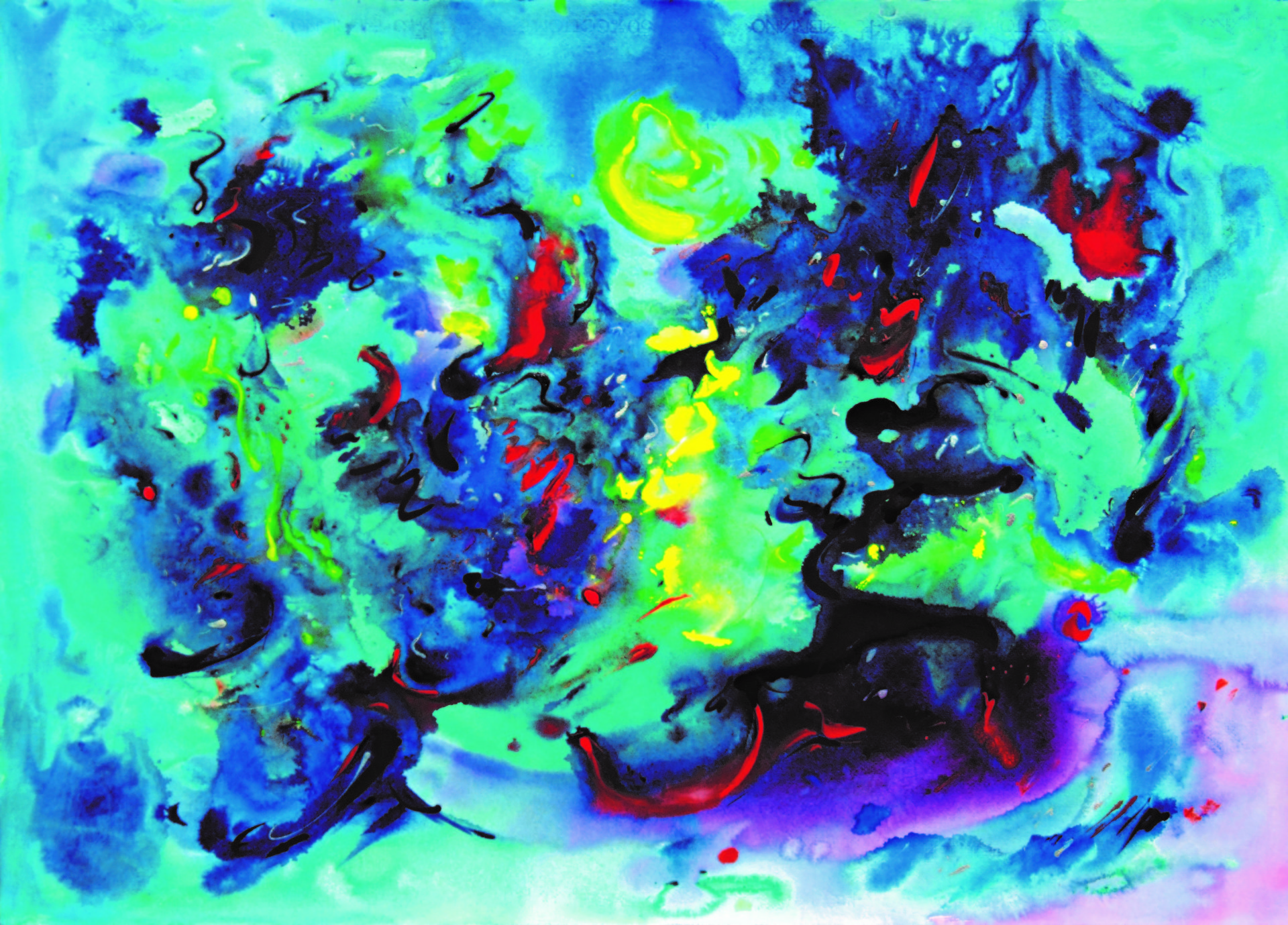 “Colore dell’ Anima” appare come la rappresentazione di uno spazio siderale, cosmico, in cui macchie di colore rosa si alternano a superfici bluastre puntellate di piccole circonferenze bianche, simili ai residui di galassie che fluttuano nell’universo. Il giallo è anche qui presente e crea una circonferenza simile a quella solare. Se nell’opera precedente vi è rappresentata l’anima nella sua interezza e nella sua inconsistente forma astratta, qui vi è invece una raffigurazione delle sfumature emotive e sensoriali che la contraddistinguono. Alla luce di ciò, l’arte di Luisa Fontalba può essere considerata un’ indagine spettroscopica del proprio mondo interiore, arricchita da un linguaggio fortemente espressivo, volto alla stimolazione estetica e sensoriale.