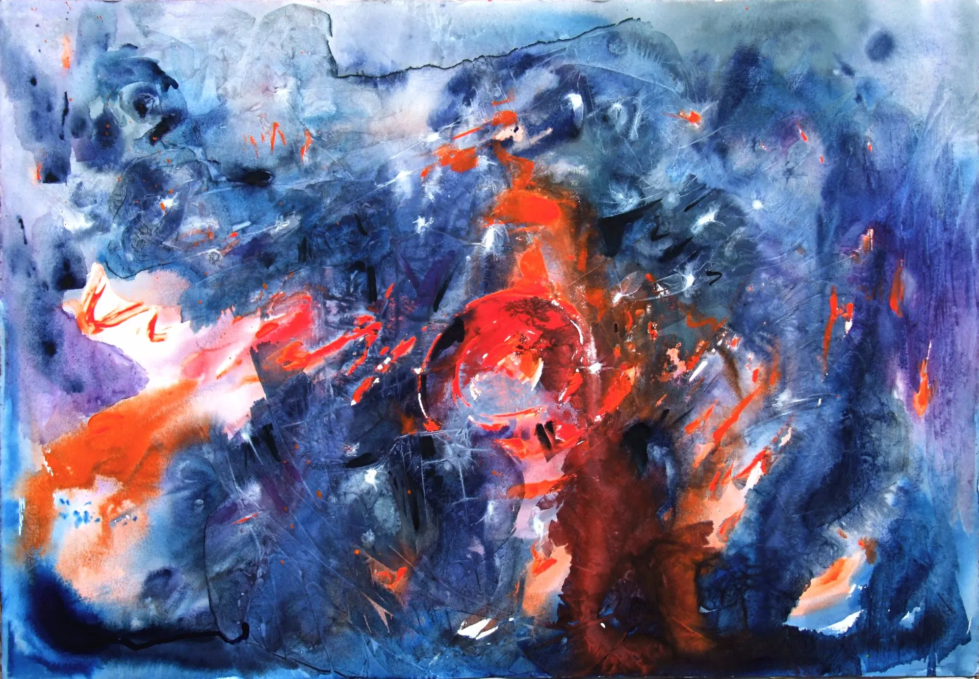 Allora non è il singolo colore, che pure può essere predominante sulla tela, a determinare la lettura dell’opera, ma l’insieme dei colori, la loro presenza e non la loro sequenza che risponderebbe a un criterio di razionalità. Qui siamo prima, siamo all’emergere da quella matrice che, sempre la Bibbia ci guida, era nelle tenebre.