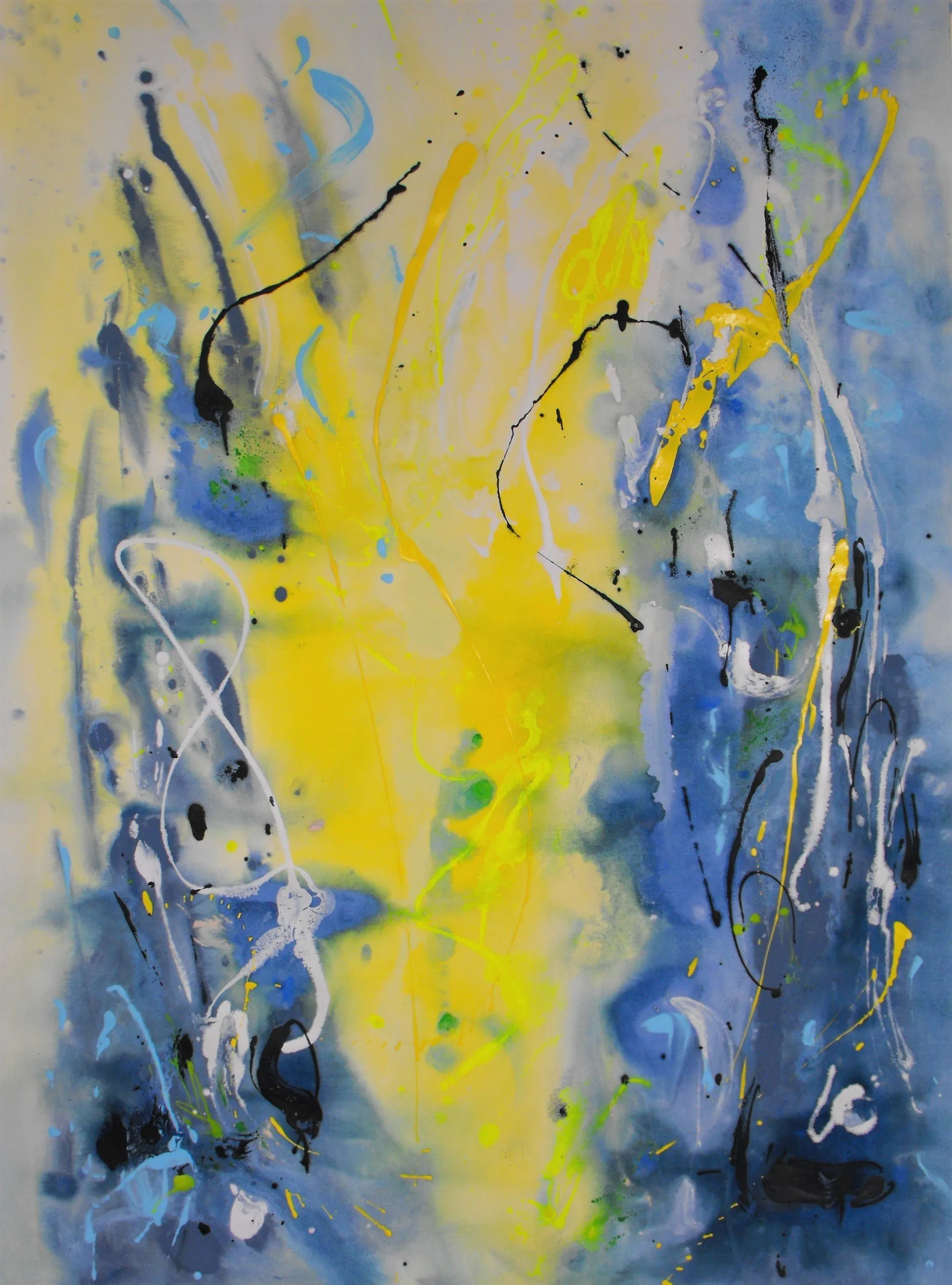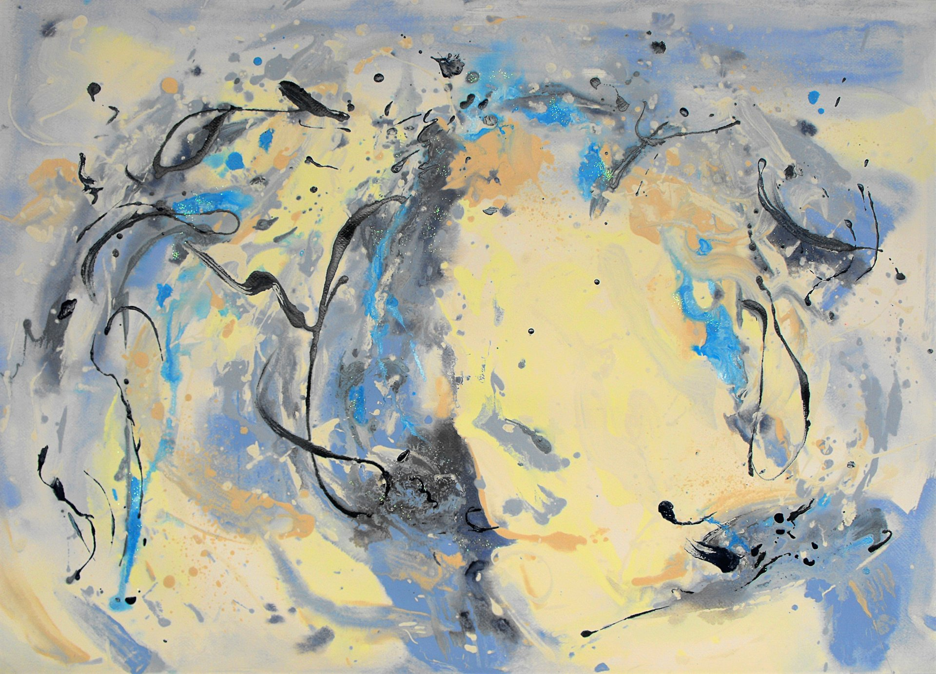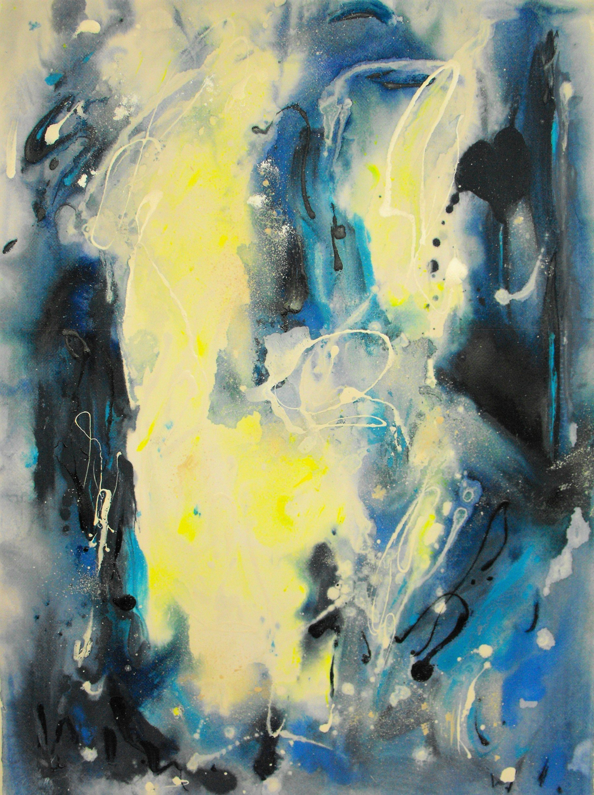 Vicino all’universo pone al centro del quadro una macchia bianca (macchia che contiene tutti i colori o nessuno) da cui si sprigionano blu e giallo che sembrano chiedere spazio anche fuori dalla tela. Oppure la cascata di Armonia di luce in cui il giallo lotta con il blu o ancora nel delicatissimo, in termini cromatici, Voli sulle nuvole in cui la tenue macchia gialla centrale sembra quasi richiamare a sé chi si sta allontanando.