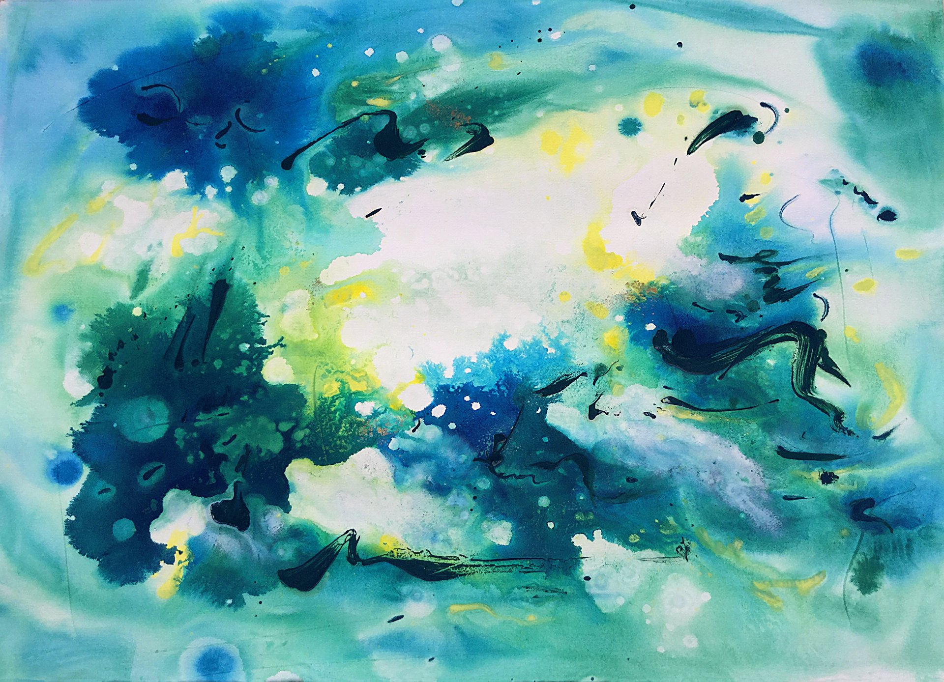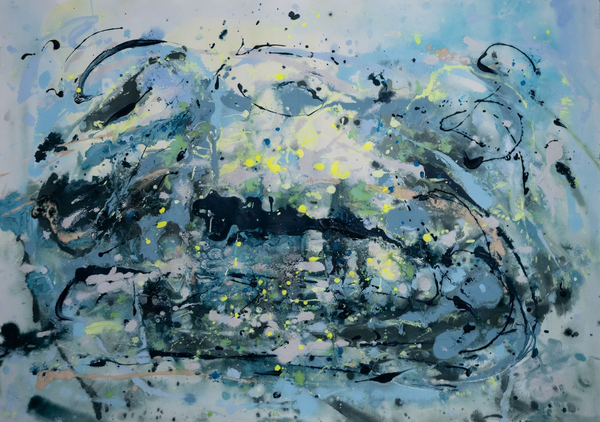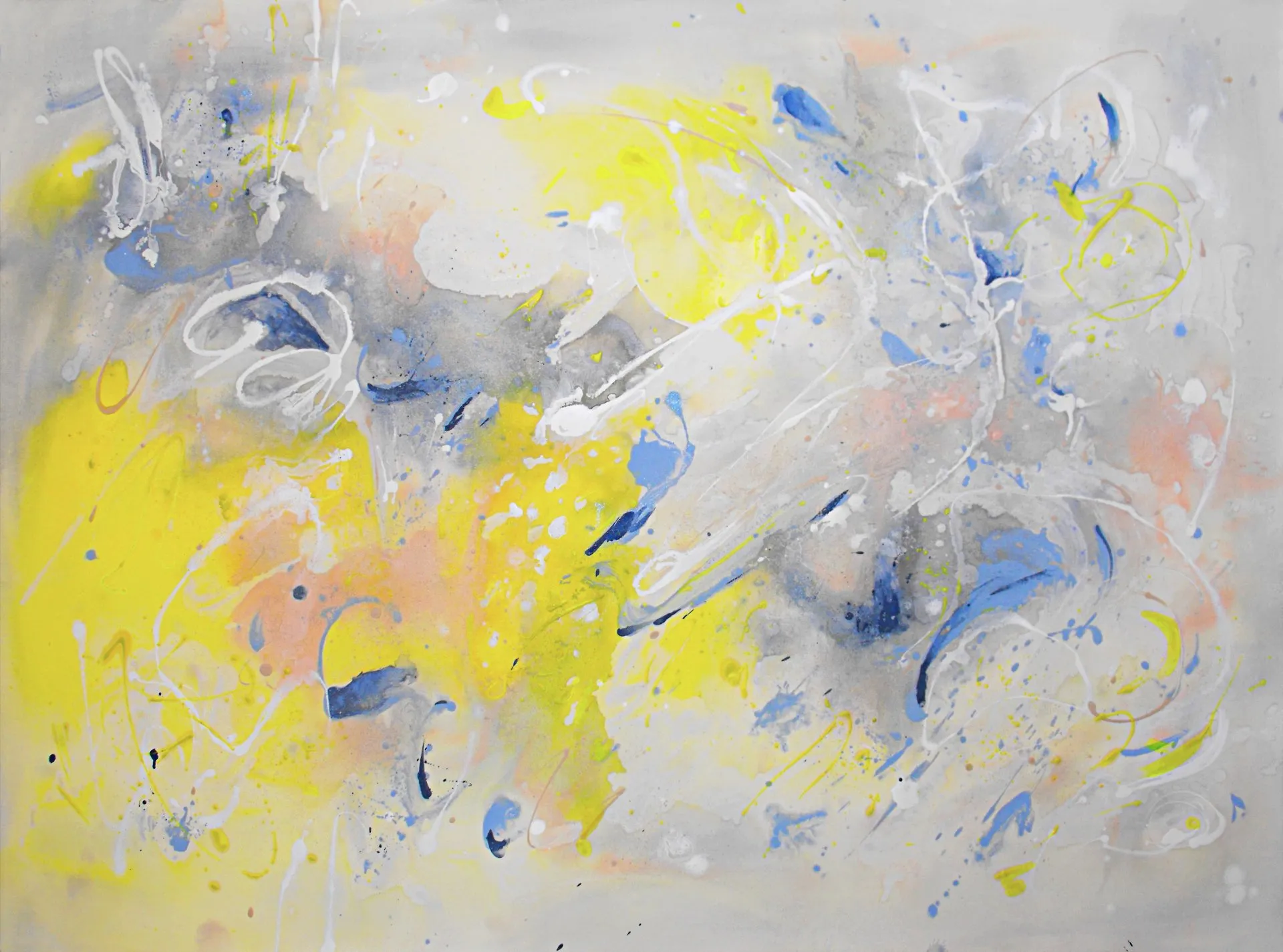 Vicino all’universo pone al centro del quadro una macchia bianca (macchia che contiene tutti i colori o nessuno) da cui si sprigionano blu e giallo che sembrano chiedere spazio anche fuori dalla tela. Oppure la cascata di Armonia di luce in cui il giallo lotta con il blu o ancora nel delicatissimo, in termini cromatici, Voli sulle nuvole in cui la tenue macchia gialla centrale sembra quasi richiamare a sé chi si sta allontanando.
