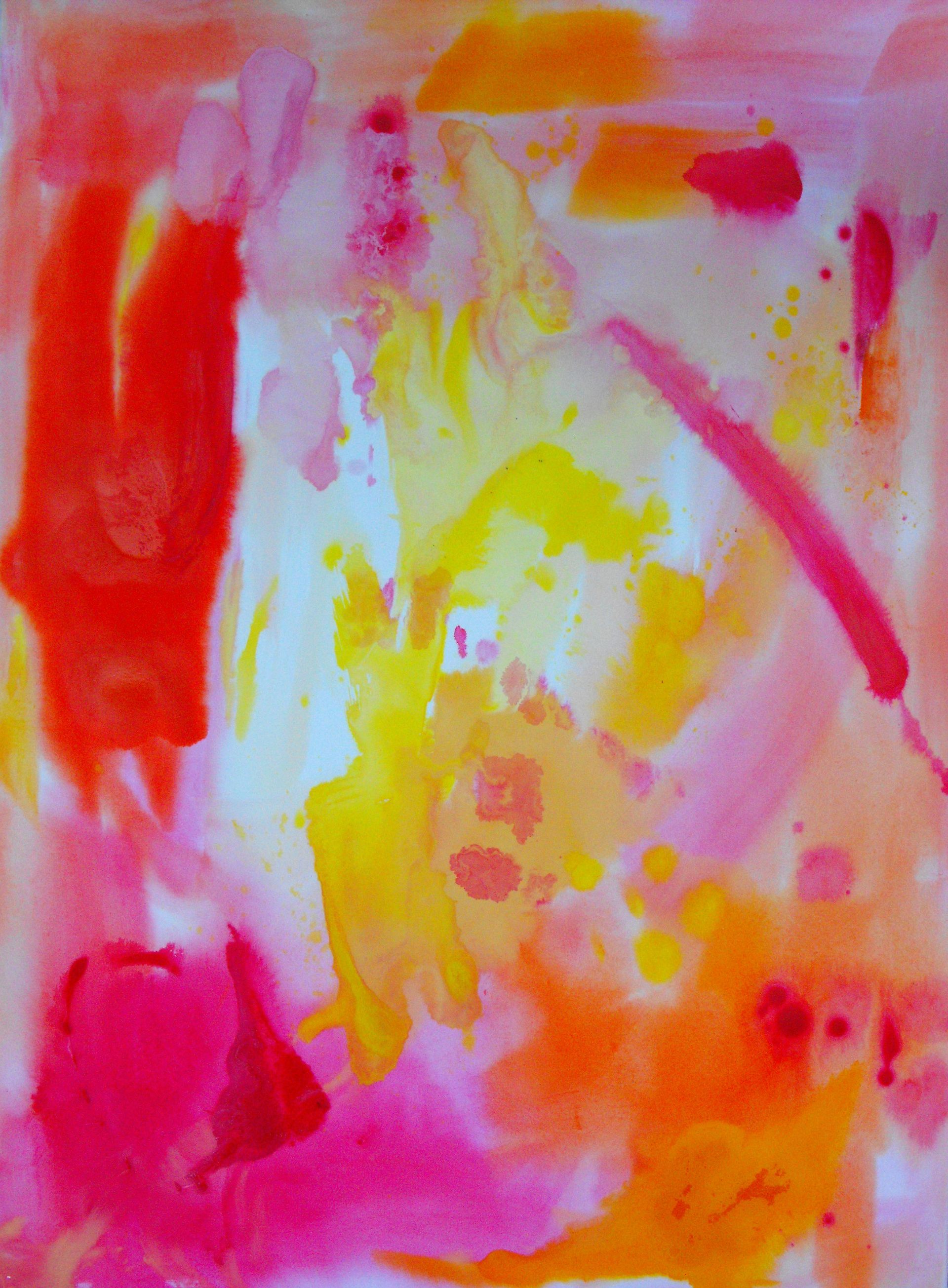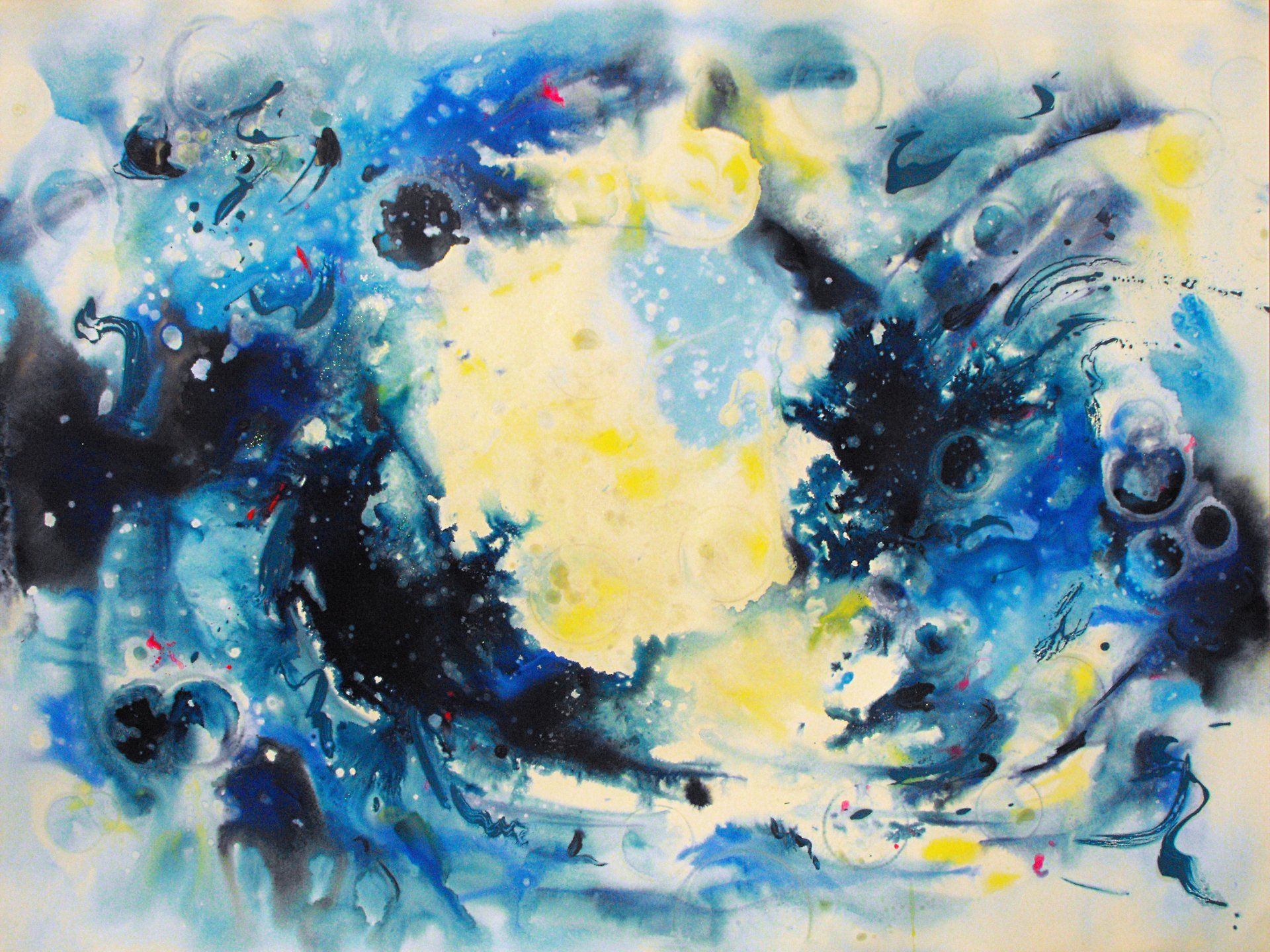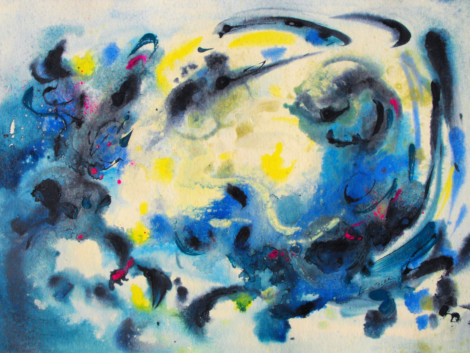 “Colore dell’ Anima” appare come la rappresentazione di uno spazio siderale, cosmico, in cui macchie di colore rosa si alternano a superfici bluastre puntellate di piccole circonferenze bianche, simili ai residui di galassie che fluttuano nell’universo. Il giallo è anche qui presente e crea una circonferenza simile a quella solare. Se nell’opera precedente vi è rappresentata l’anima nella sua interezza e nella sua inconsistente forma astratta, qui vi è invece una raffigurazione delle sfumature emotive e sensoriali che la contraddistinguono. Alla luce di ciò, l’arte di Luisa Fontalba può essere considerata un’ indagine spettroscopica del proprio mondo interiore, arricchita da un linguaggio fortemente espressivo, volto alla stimolazione estetica e sensoriale.