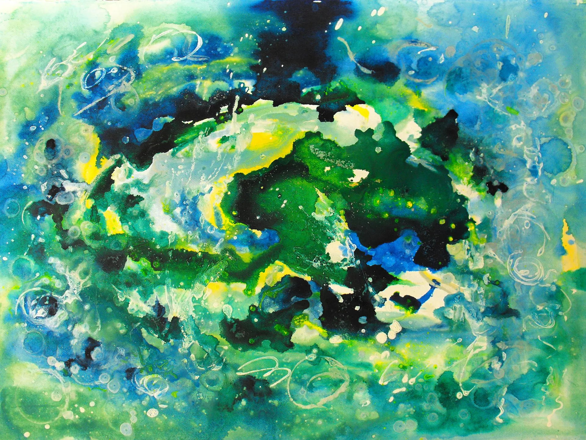 Vicino all’universo pone al centro del quadro una macchia bianca (macchia che contiene tutti i colori o nessuno) da cui si sprigionano blu e giallo che sembrano chiedere spazio anche fuori dalla tela. Oppure la cascata di Armonia di luce in cui il giallo lotta con il blu o ancora nel delicatissimo, in termini cromatici, Voli sulle nuvole in cui la tenue macchia gialla centrale sembra quasi richiamare a sé chi si sta allontanando.