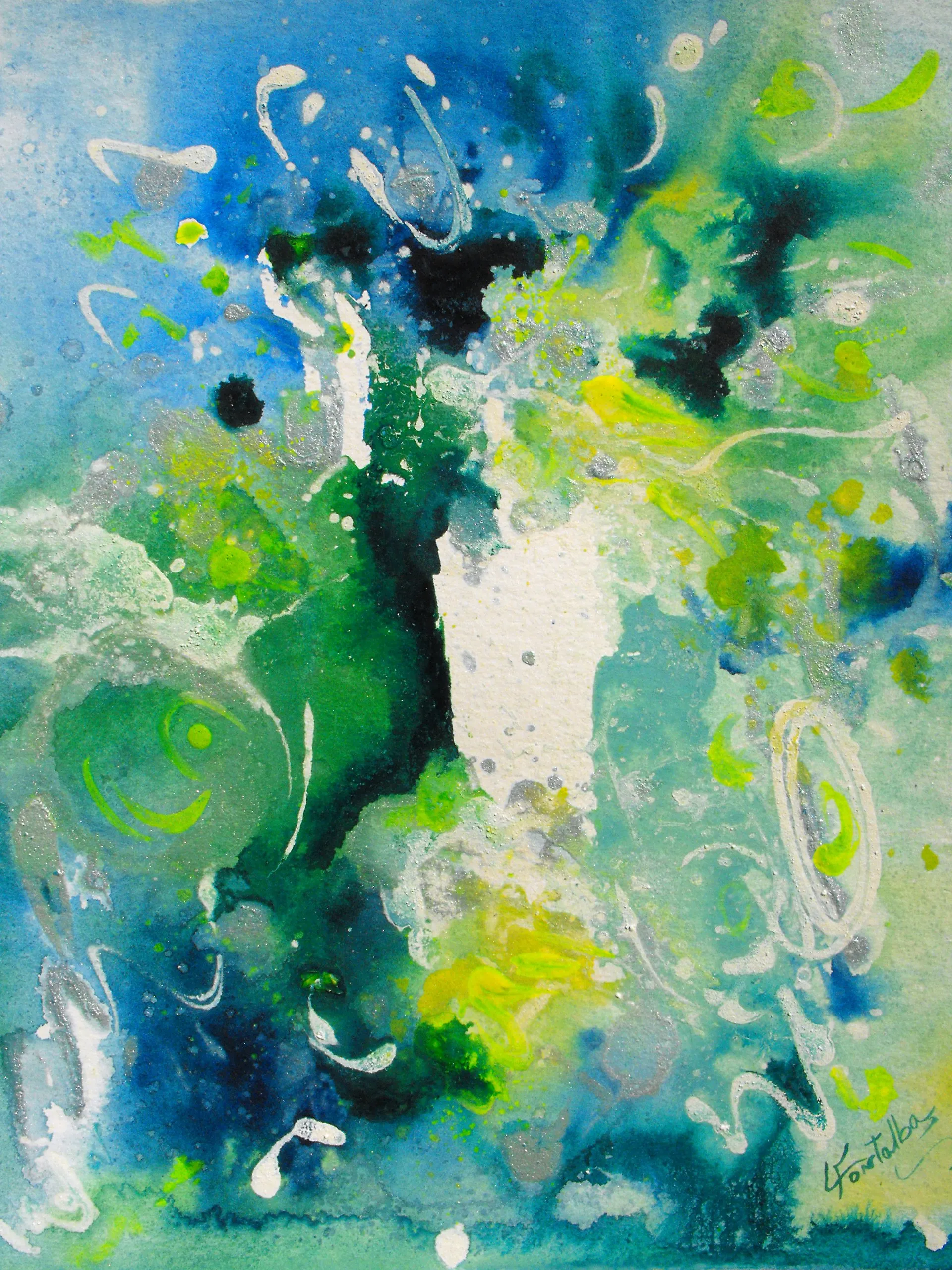 Luisa Fontalba lavora nel momento in cui il soggetto, la pittrice, e l’oggetto, l’universo, si incontrano e coglie il momento della creazione, quello in cui le cose sono in divenire perché non ancora divise, che è anche il momento a cui attinge la creazione personale, artistica, oserei dire privata.